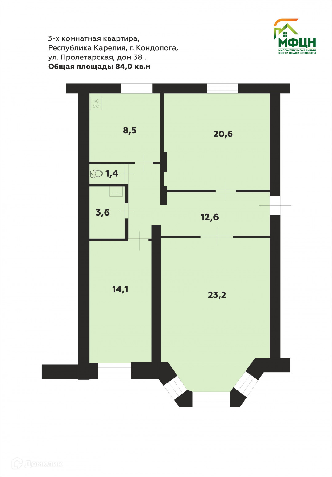 Площади комнат и кухни: 20.6; 14.1; 23.2; кухня 8.5 кв. м.