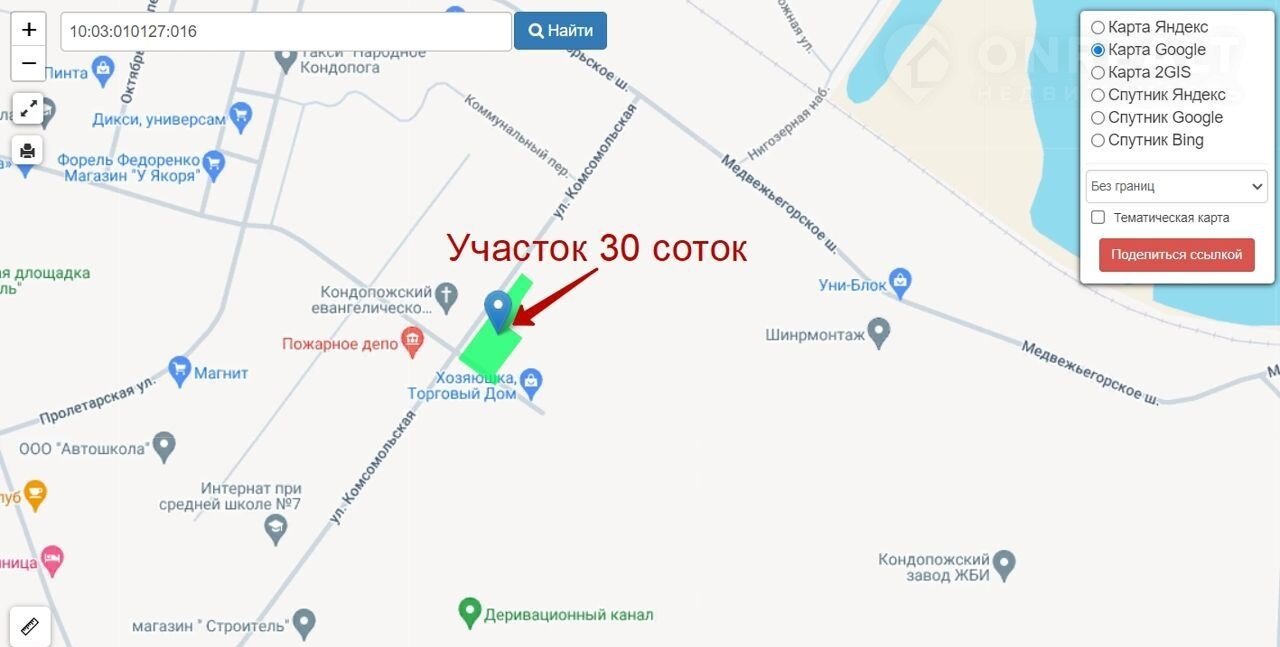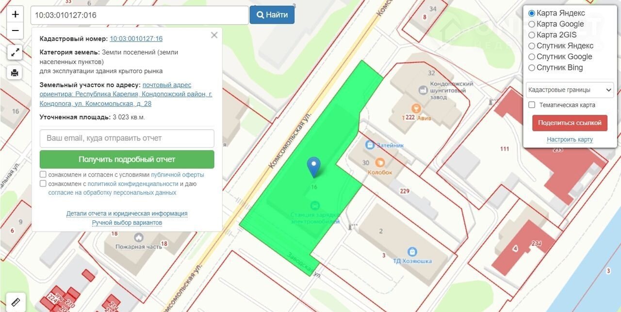 2. Зeмельный участок, кадастровый номер 10:03:0010127:16 , площадью 3023+/-19 кв.м. ( 30,23 сотки ), разрешённое использование: для эксплуатации здания крытого рынка.