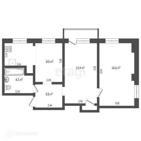 Площадь квартиры 60 кв. метров. Просторная кухня 1 кв. метров. Две комнаты 15,4/16,6 кв. метров соответственно. Совмещенный СУ в кафеле.