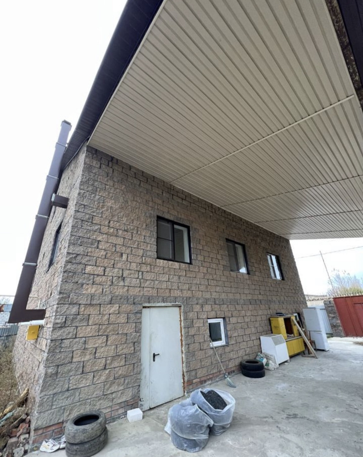 Крыша продолжается большим навесом до забора, например для создания летней беседки.