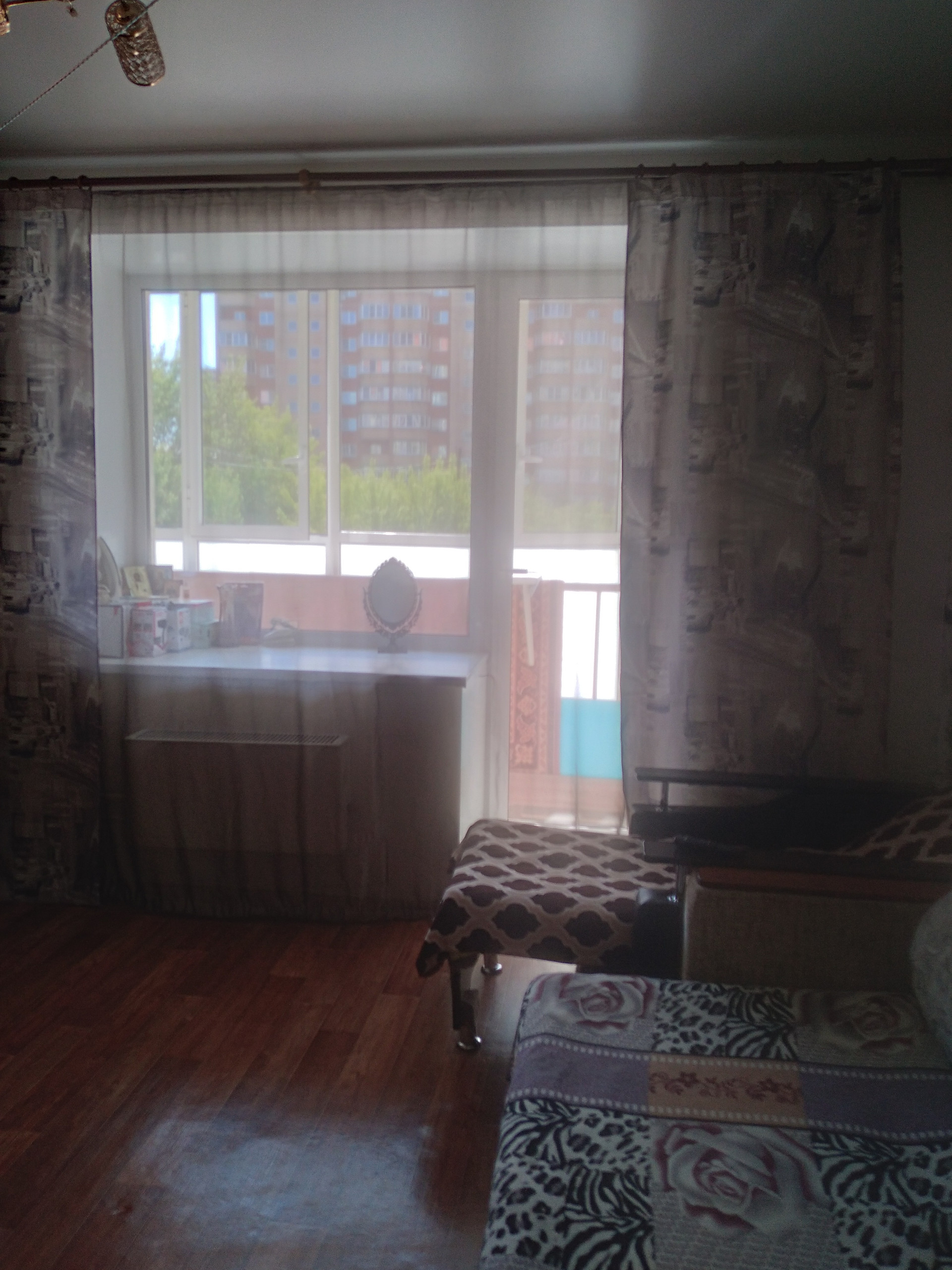 В квартире косметический ремонт, в ванной комнате панели, на полу линолеум. Окна выходят во двор на южную сторону, поэтому очень тихо и тепло. Большая лоджия.