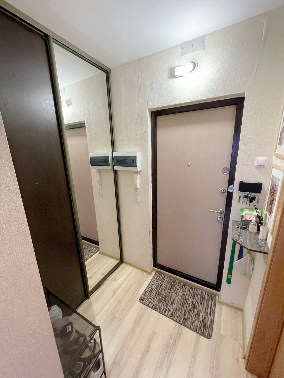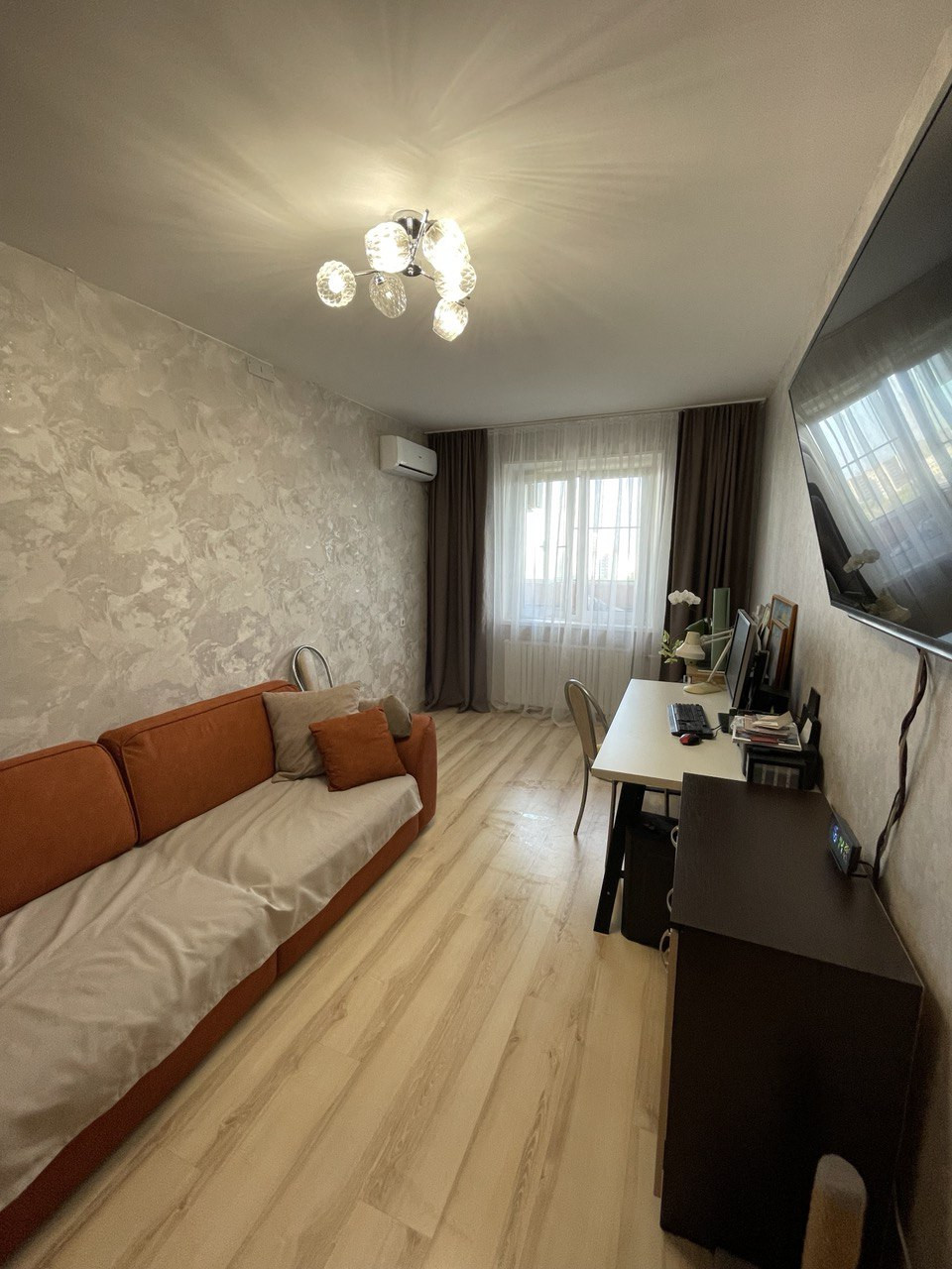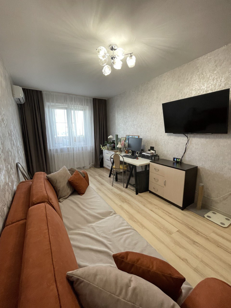 Квартира теплая, аккуратная, оформлена в современных серо-бежевых оттенках. 9 этаж не крайний, всегда светло и тихо. Общая площадь квартиры без учета площади балкона составляет 32 кв м, комната имеет площадь 16,5кв м, кухня – 6,5кв м, совмещенный санузел, просторный коридор с гардеробом, огромный балкон на 2 окна.