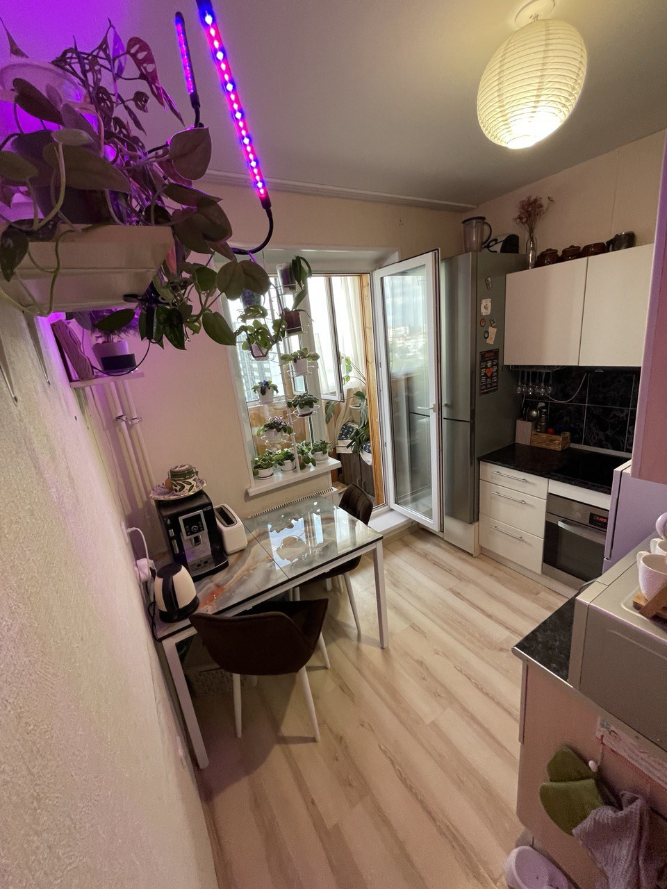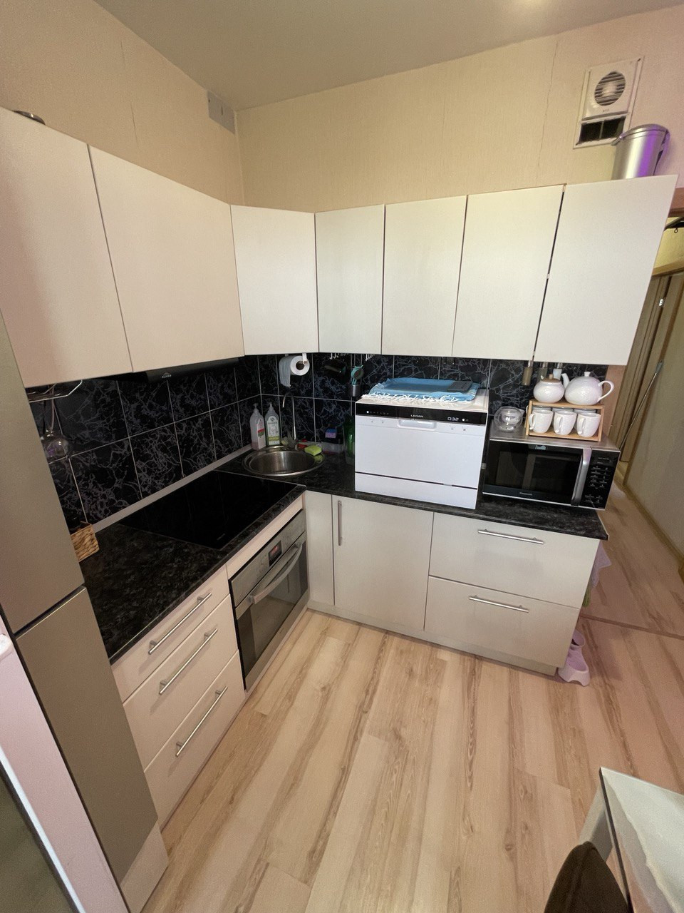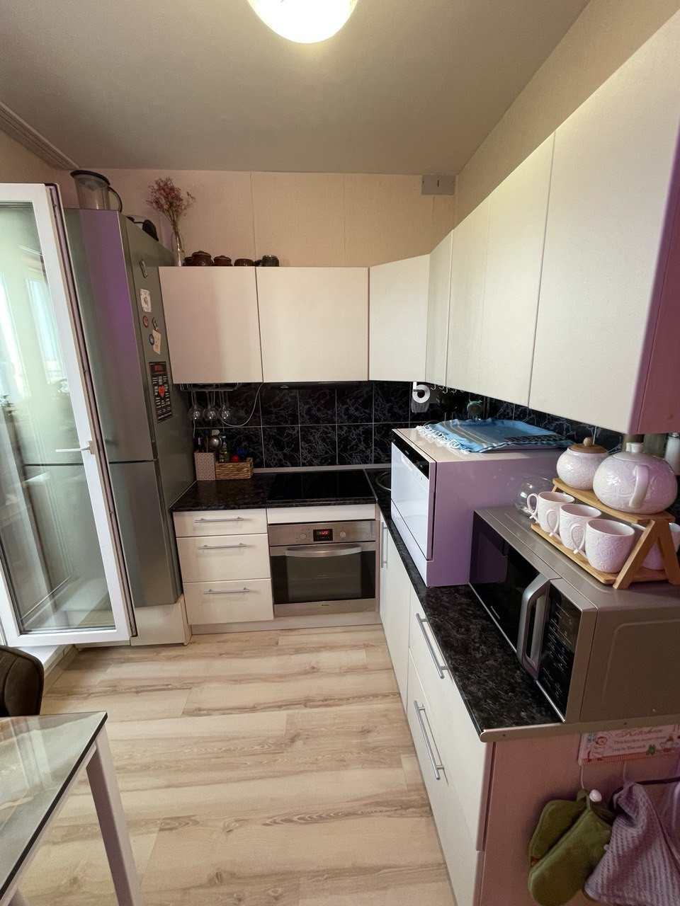 В квартире остается: шкаф и кондиционер, кухонный гарнитур со встроенной духовкой с режимом конвекции, индукционной варочной поверхностью, гардеробная система в коридоре.