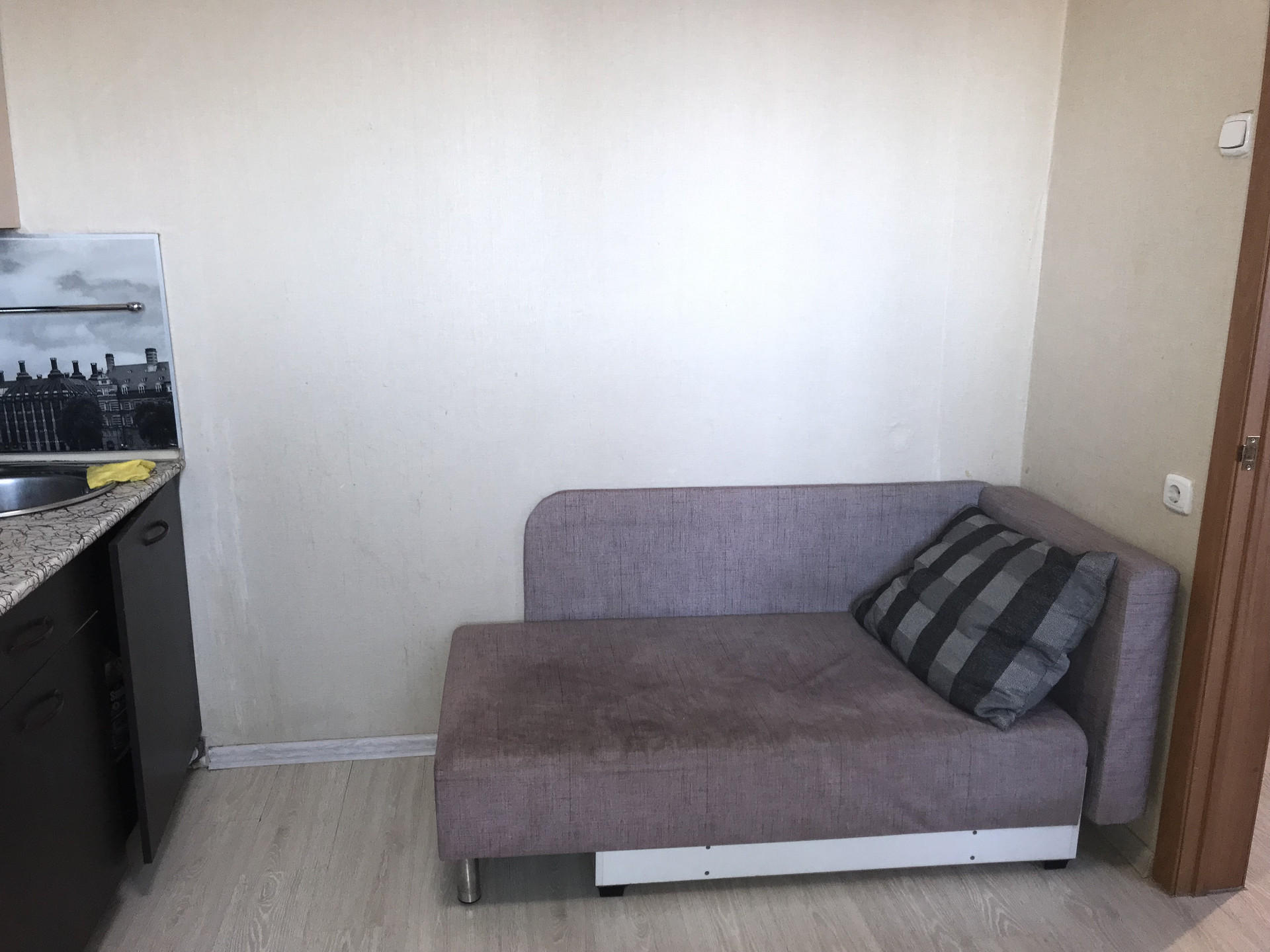 Мебель: диван двуспальный, диванчик на кухне, большой шкаф-купе, кухонный гарнитур, стол, 2 стула, полка для обуви, зеркала.