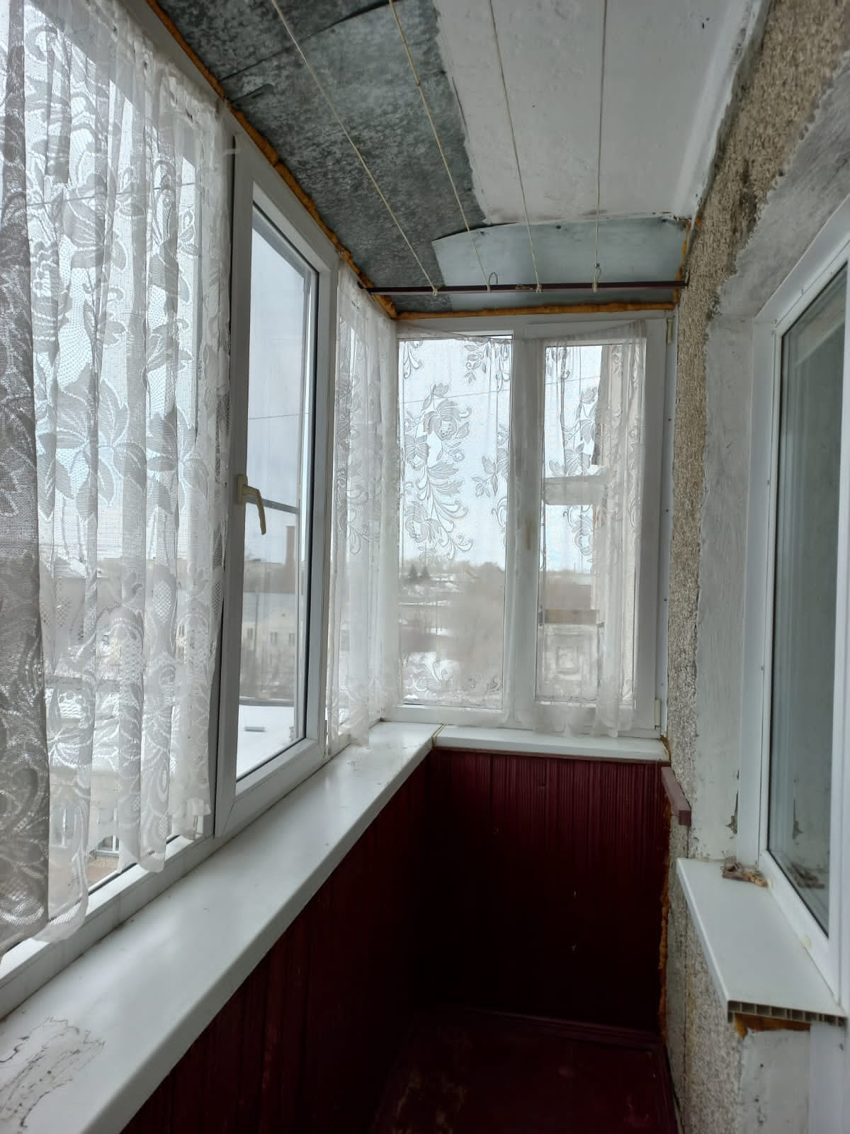 Окна все пластиковые, балкон застеклен также пластиковыми европакетами и обшит вагонкой, на кухне натяжной потолок, в ванной и туалете кафель.
