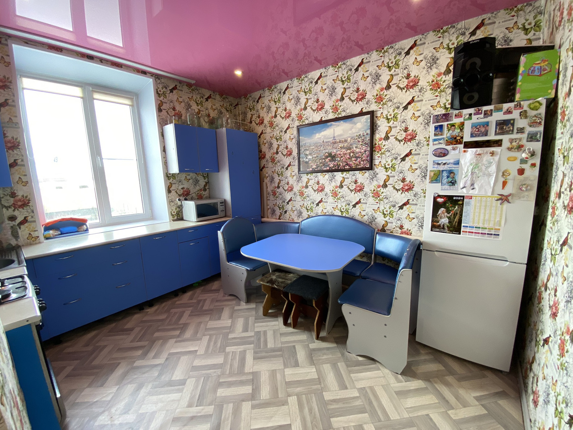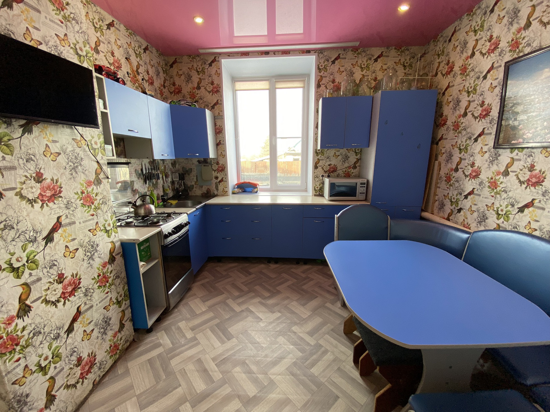 На кухне остается кухонный гарнитур.