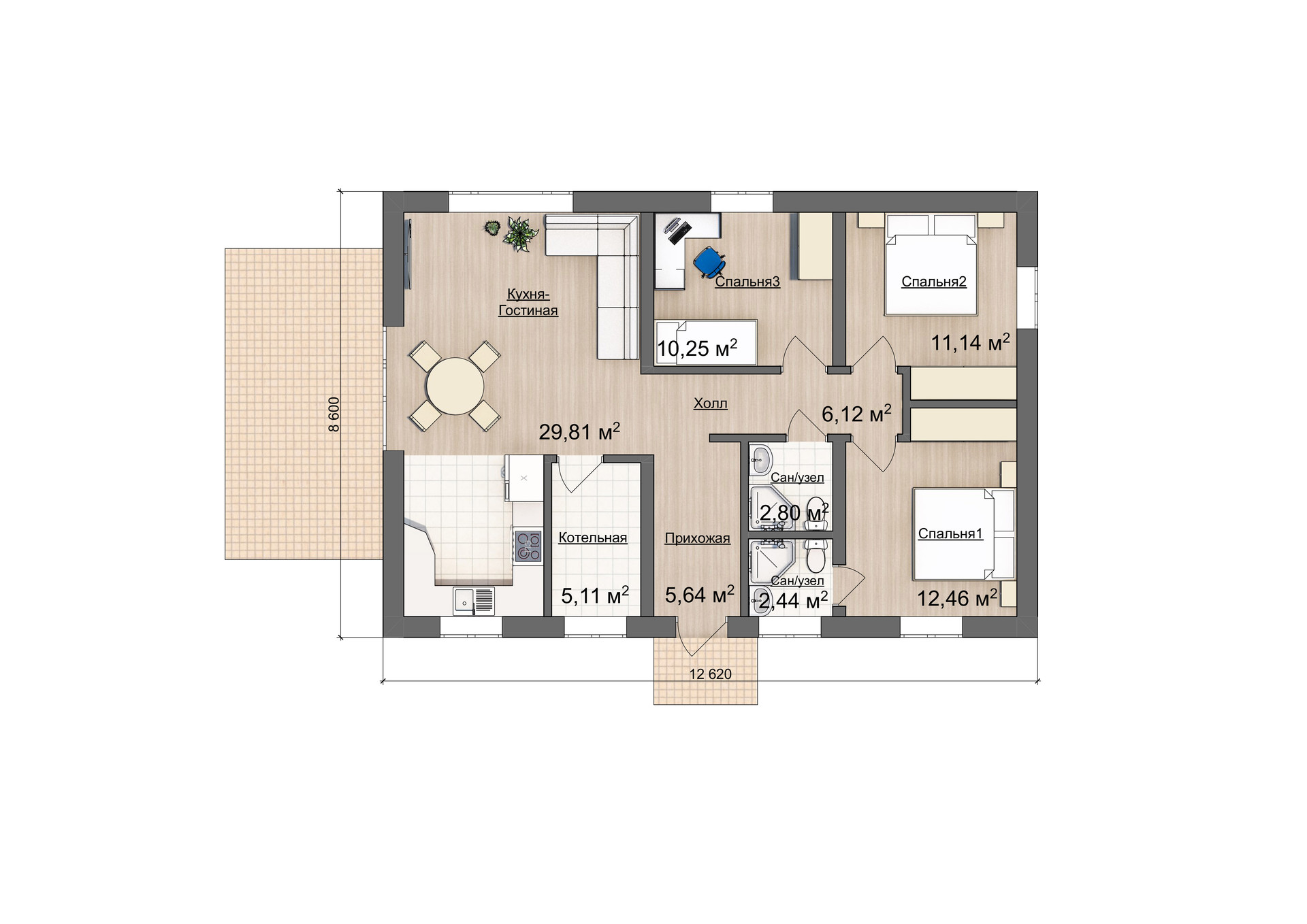 Представляем вашему вниманию одноэтажный дом 12,62х8,6 по проекту Загорянка, общей площадью 108,5 кв м с живой, меняющейся панировкой. Это полностью отработанный проект, который постоянно совершенствуется и масштабируется. Дом из газобетонных блоков на монолитном плитном фундаменте. Он имеет внутреннюю площадь 86 кв м и разместил в себе все необходимые для комфортной жизни помещения: кухня-гостиная, 3 жилых спальни, 2 санузла,  котельная и прихожая. Все продумано до мелочей. Более того, вы всегда сможете адаптировать дом под себя, увеличить площадь или изменить планировку.