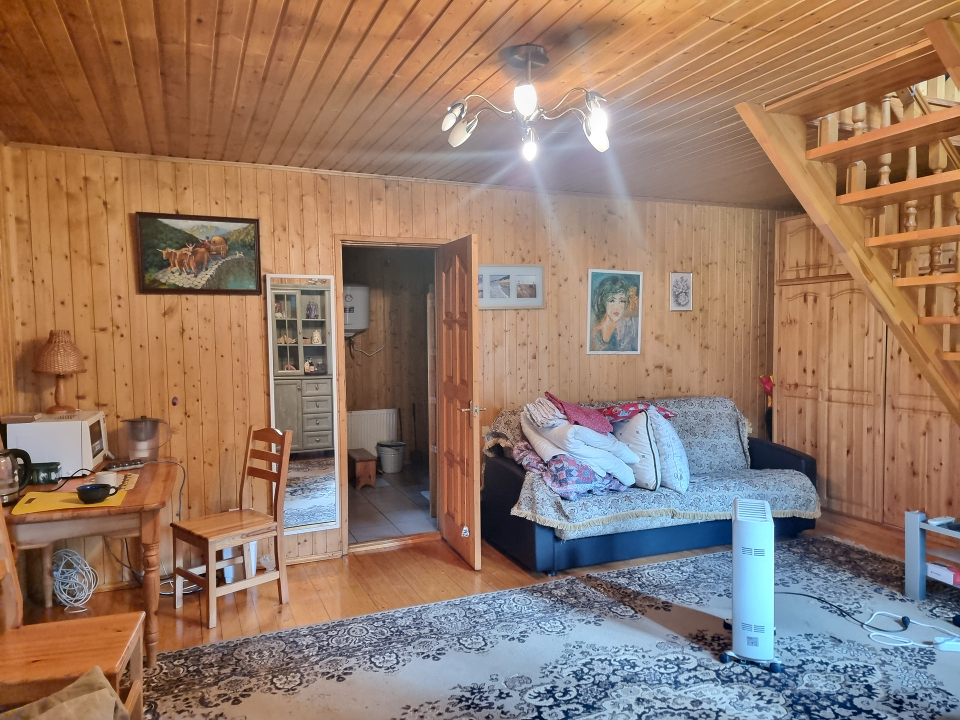 1 этаж дома:  прихожая, кухня – гостиная   37 кв.м. с выходом на веранду, комната  13 кв.м., кабинет 10 кв.м.,  бойлерная, с/у совмещенный  с душем.
