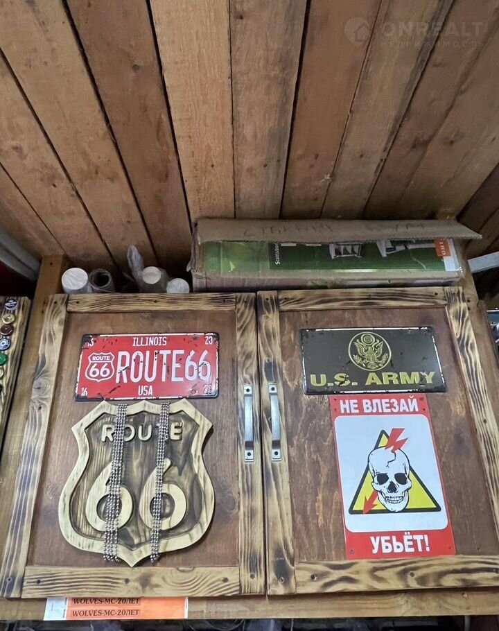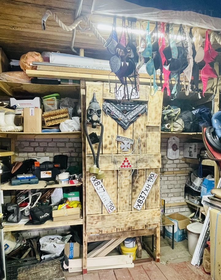 В гараже установлена охранная сигнализация, договор с Вневедомственной охраной. По периметру гаража -широкие деревянные  стеллажи со шкафами.