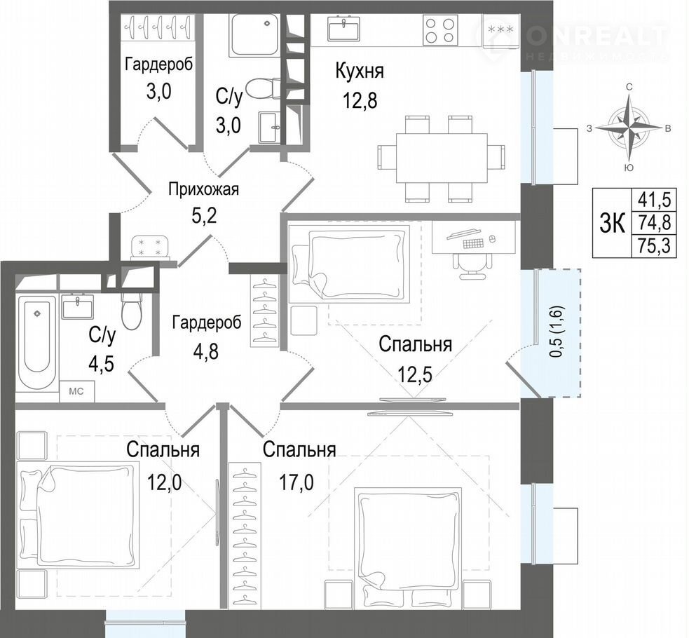 Общая площадь 74.8 м2