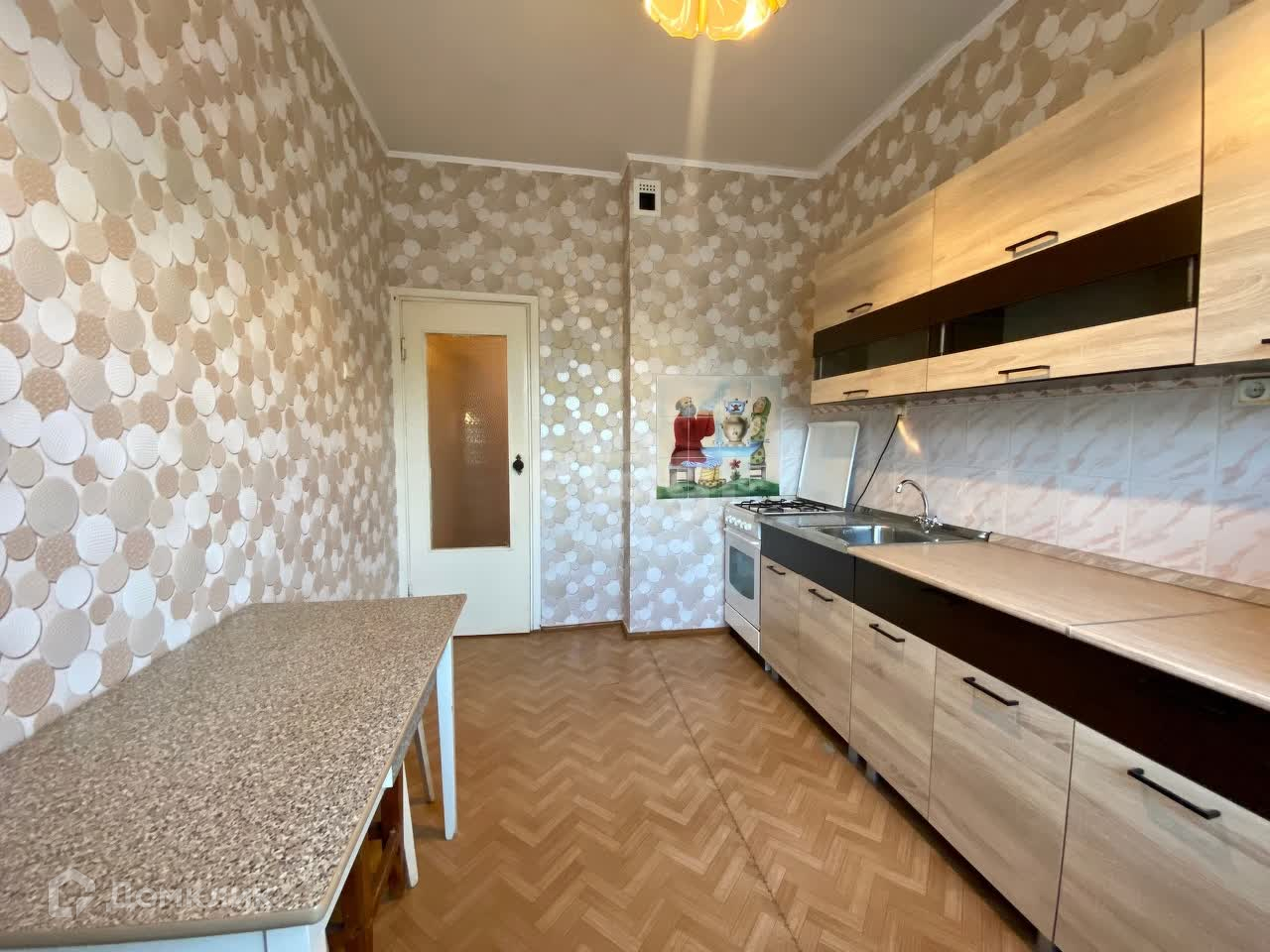 В кухне новый кухонный гарнитур с набором необходимых шкафов. Отделка кухни – обои, декоративный фартук. Для приготовления пищи – газовая плита.