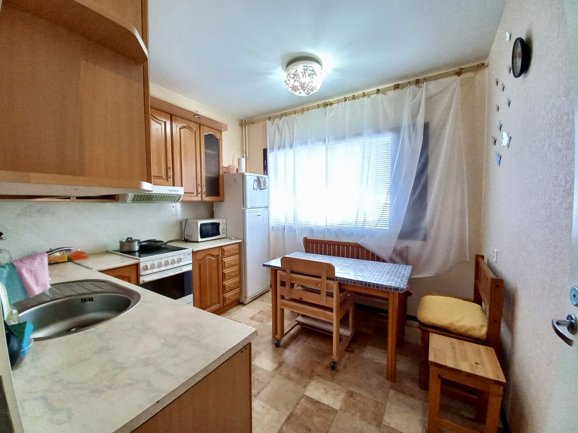 К покупке предлагается двухкомнатная квартира на две стороны, расположенная на высоком первом этаже. В квартире заменена входная дверь, линолеум на кухне. Ванна демонтирована и хранится на лоджии. При продаже остается кухонный гарнитур, вся мебель и техника. В шаговой доступности детский сад, школа, сетевые магазины, недалеко от центра города.