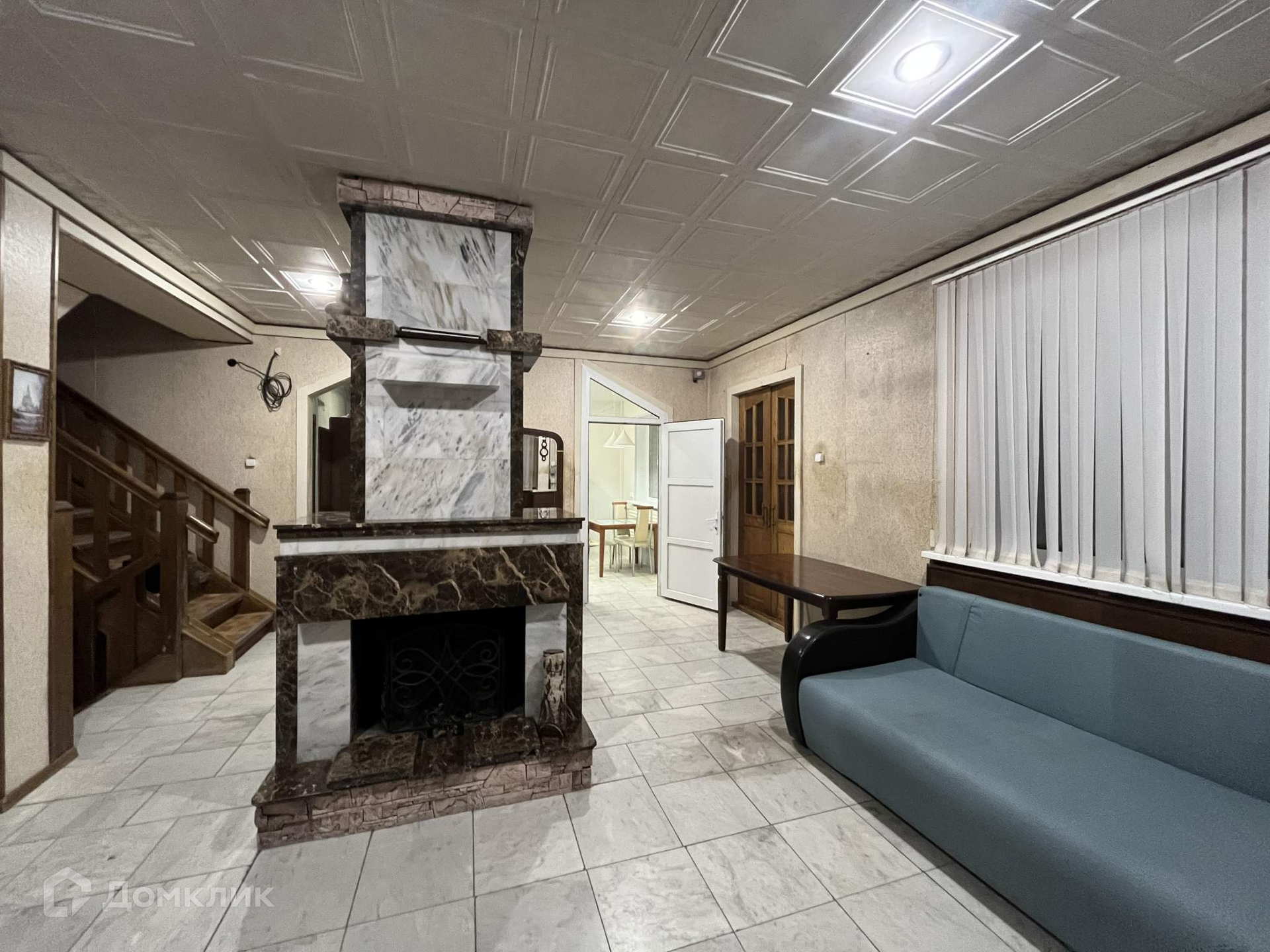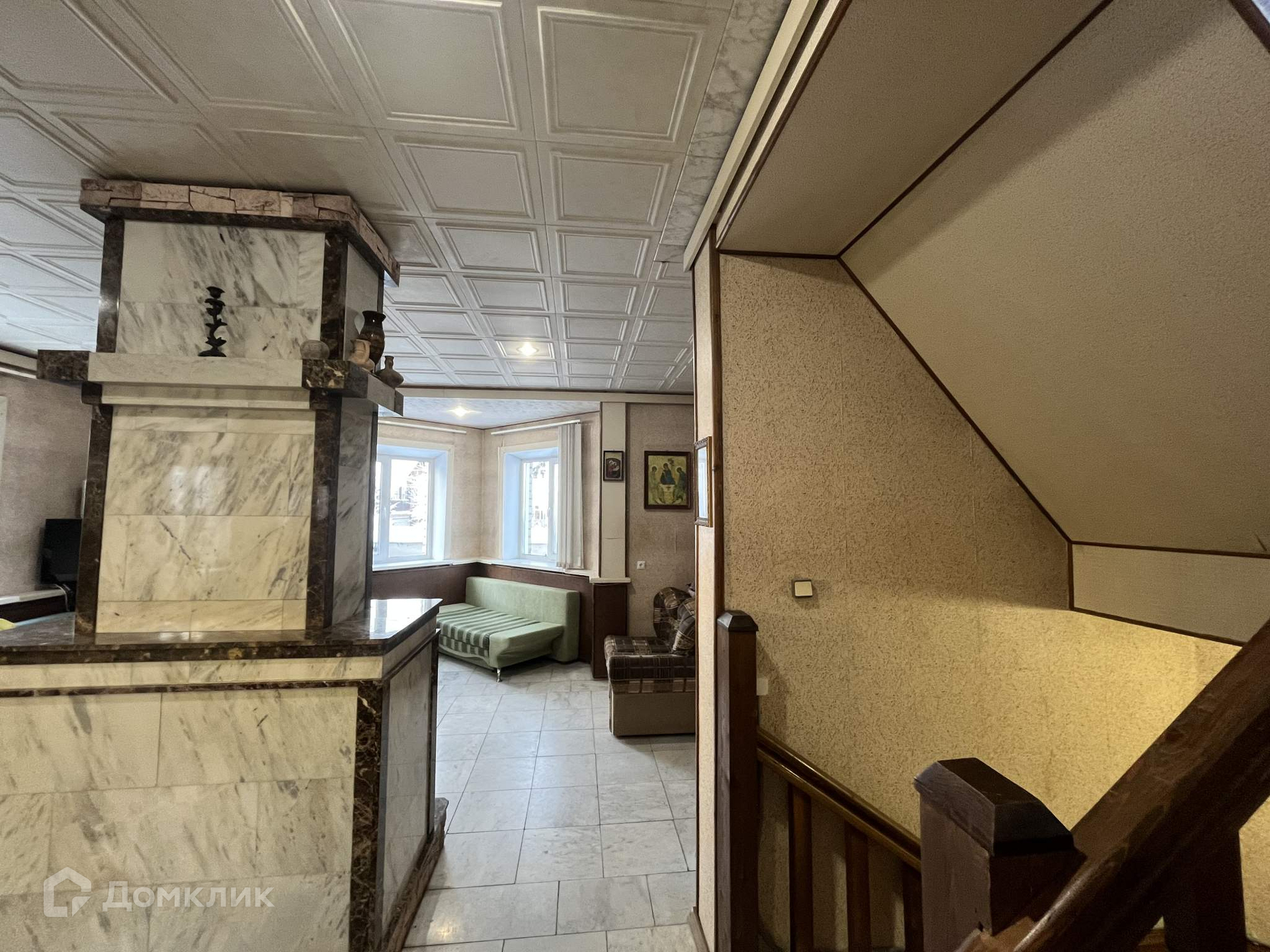 Первый этаж: каминный зал с натуральным мрамором, кухня (9,5 м2), санузел с душевой, гараж.