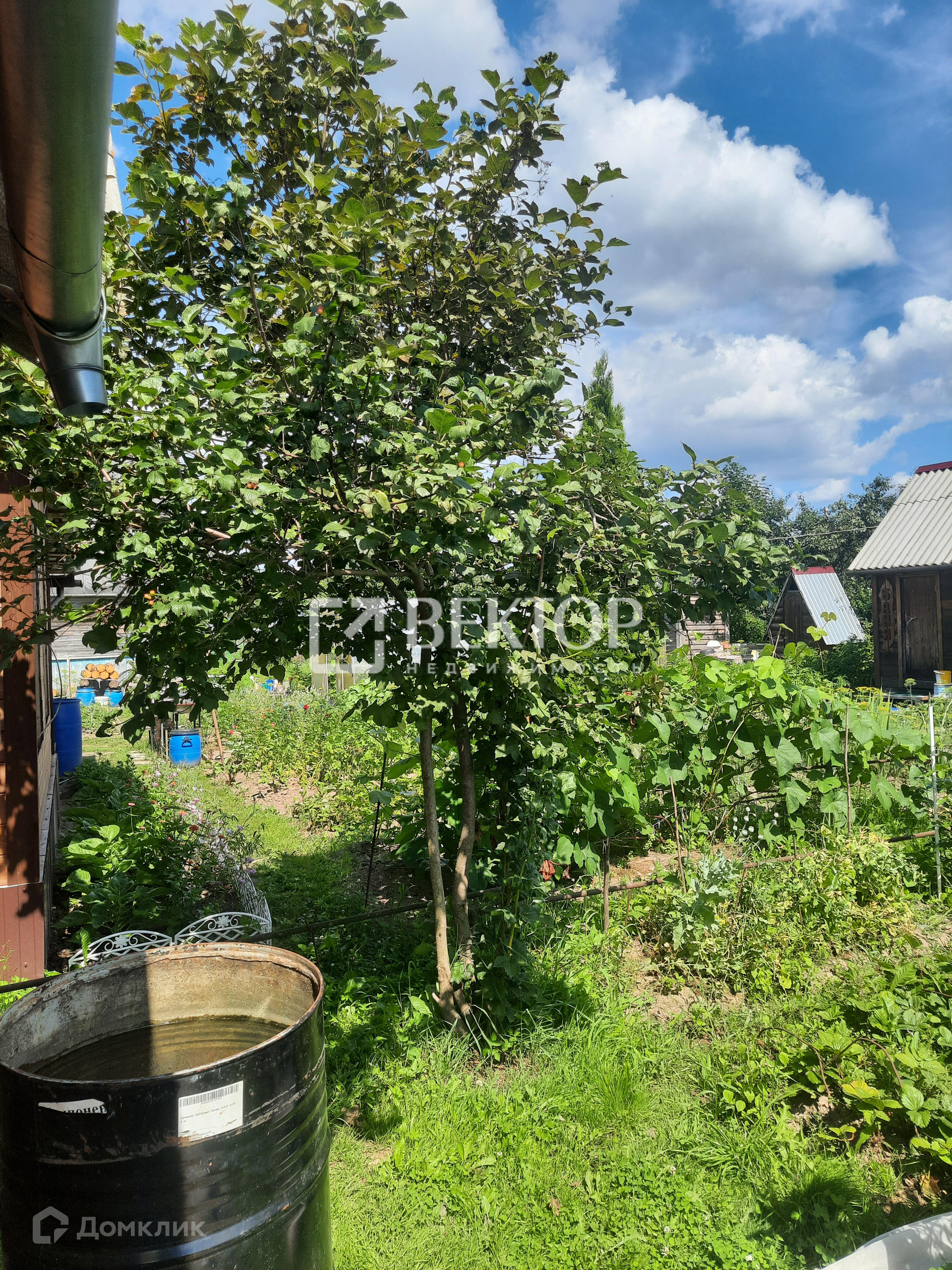 На участке из плодово-ягодных растений имеются яблони, вишня, дюк, виноград с огромными гроздьями.