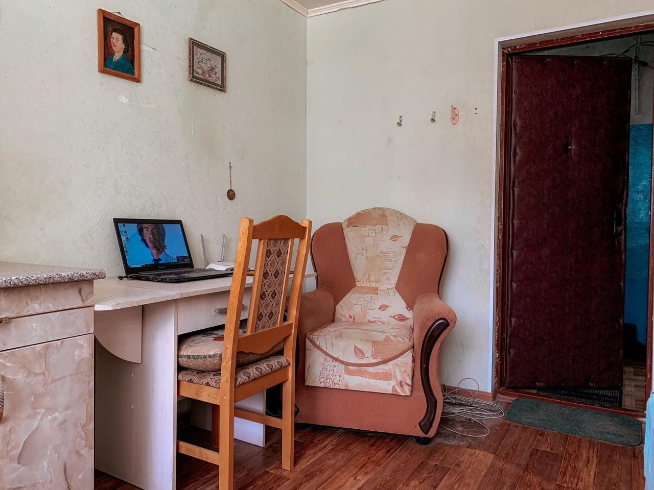 Сделан комплексный косметический ремонт, а именно поклеены современные обои с ненавязчивой текстурой, натянут потолок, обустроено освещение в виде точечных светильников, которых шесть штук, постелен прочный линолеум с рисунком под паркет и установлено широкое ПВХ-окно, выходящее на улицу. Вся эта красота защищена прочной стальной дверью с надежными замками и шумоизоляцией.