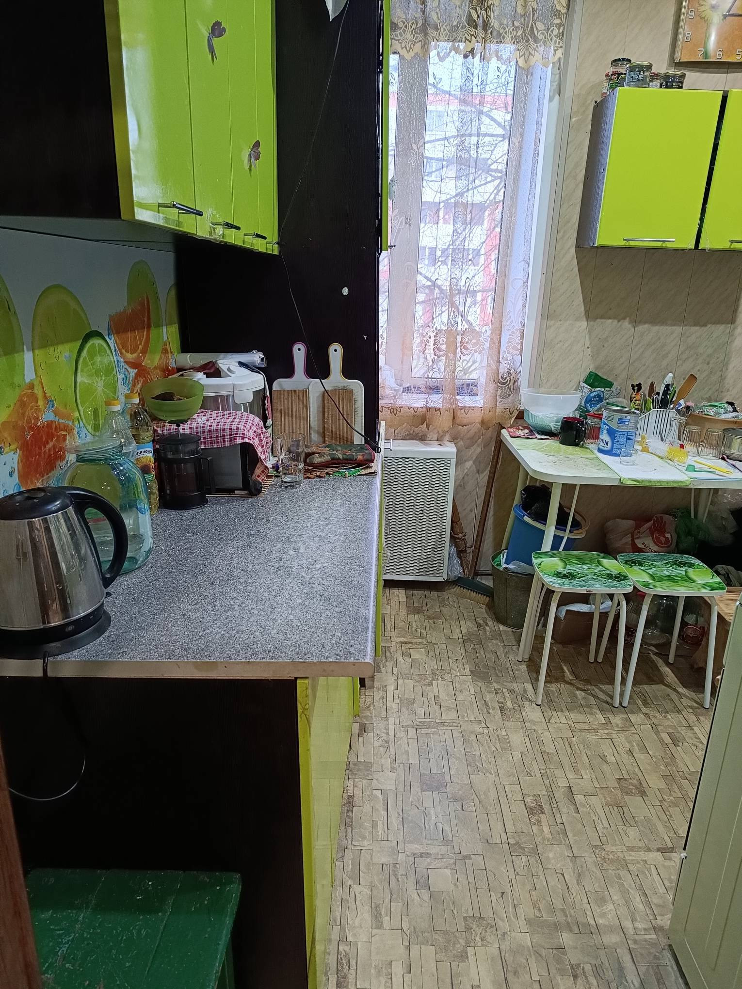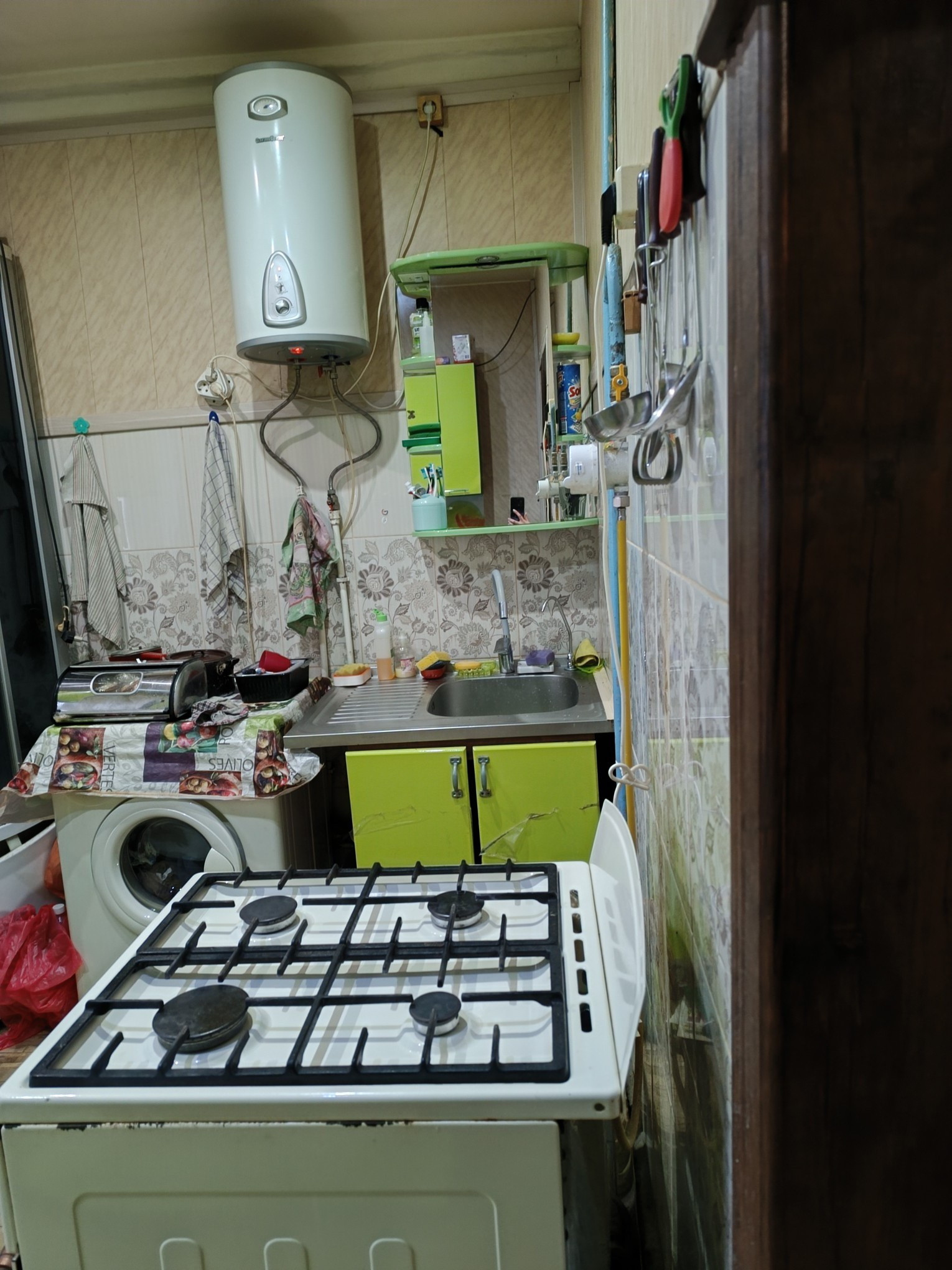 Душевая установлена на кухне, есть возможность сделать перепланировку- изолировать санузел.