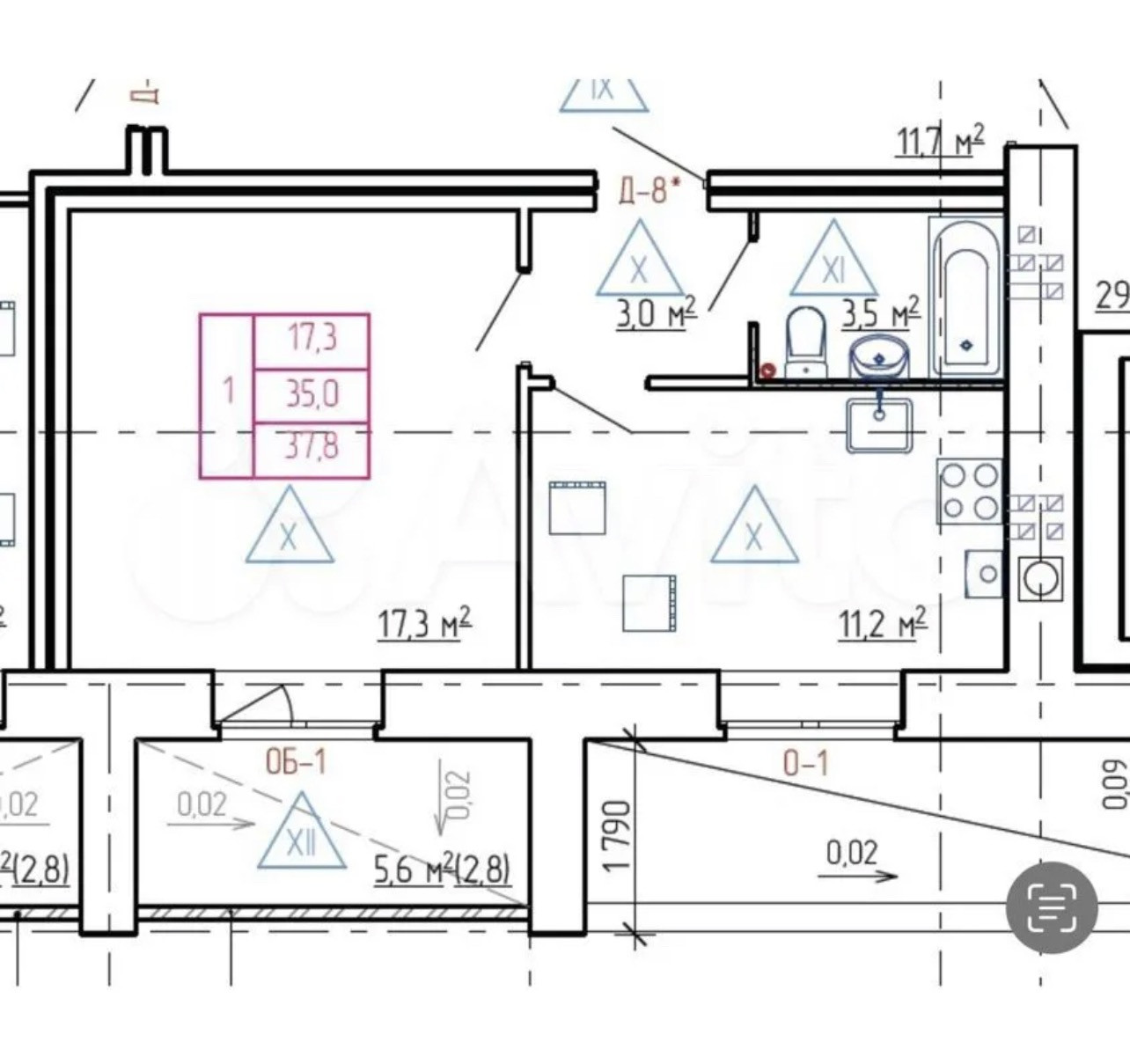 Общая площадь 38.8 м2