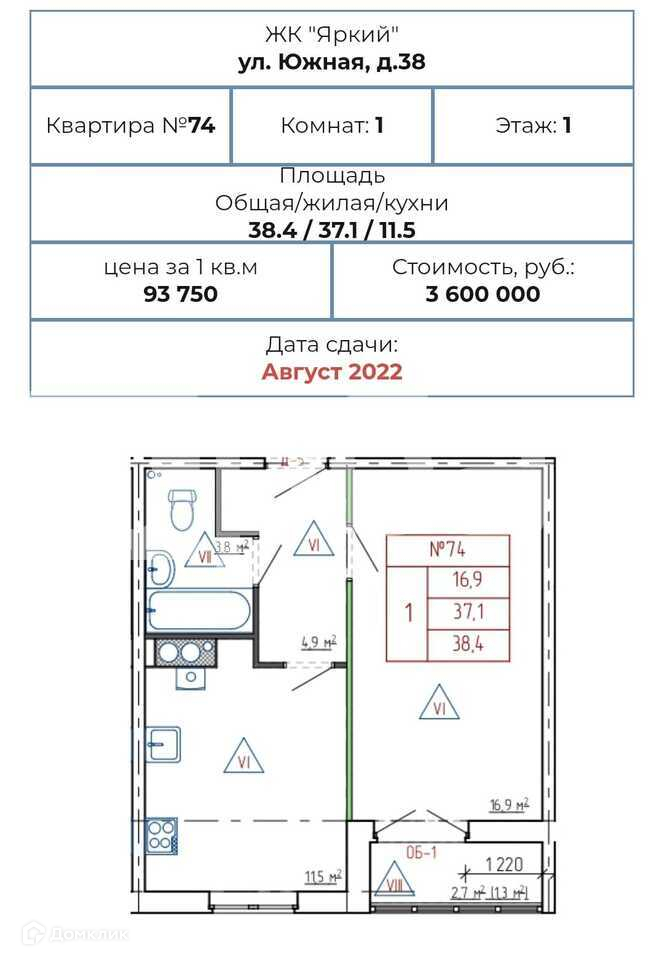 Площадь квартиры 38,4 м2, площадь кухни 11,5 м2, лоджия.