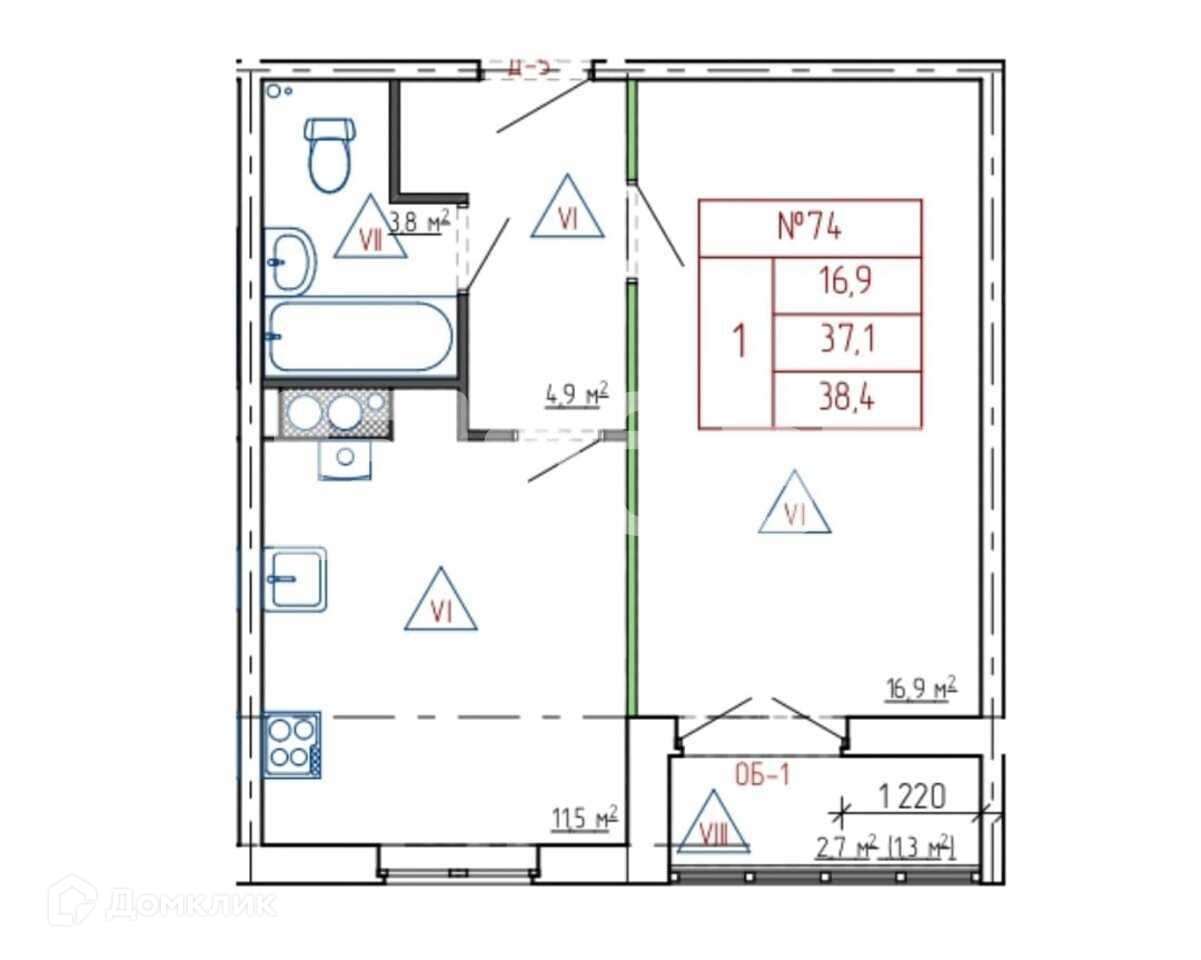 Общая площадь 38.4 м2