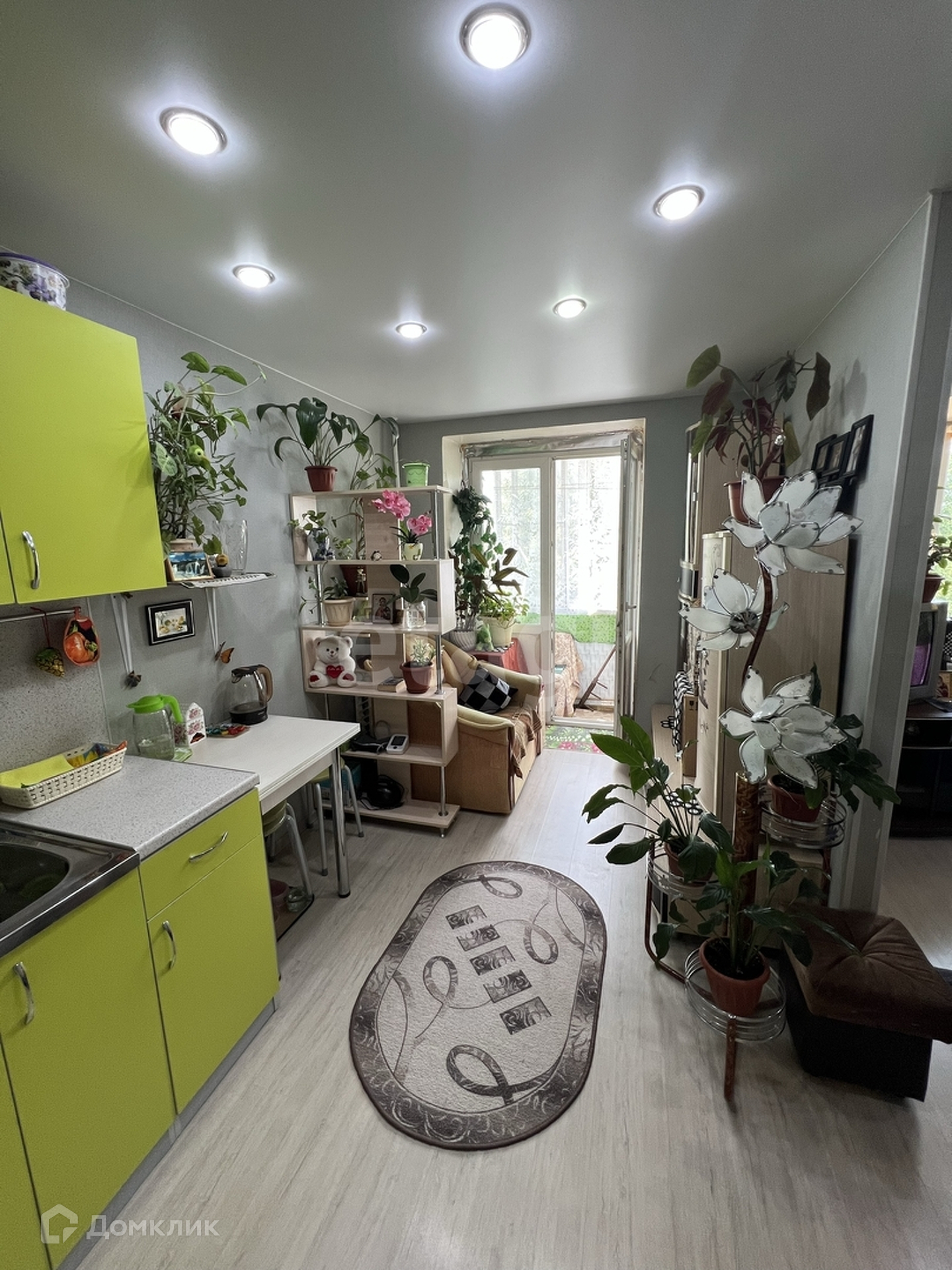 Балкон застеклен. Квартира разделена на 2 комнаты: кухня гостинная и детская / спальня.