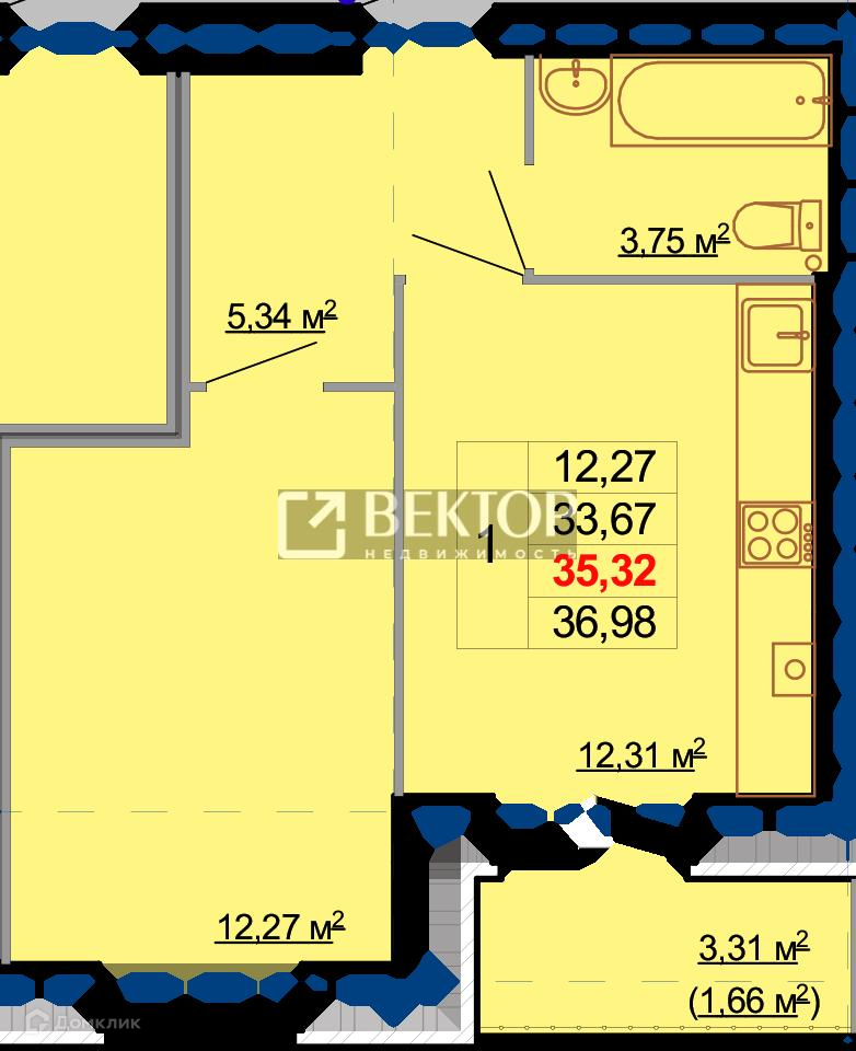 Общая площадь 35.32 м2