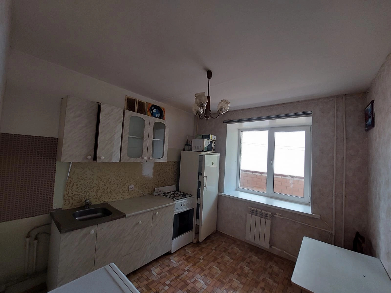 На кухне установлен кухонный гарнитур, есть микроволновка, стиральная машинка.Из мебели диван и стол.В квартире шикарная лоджия.