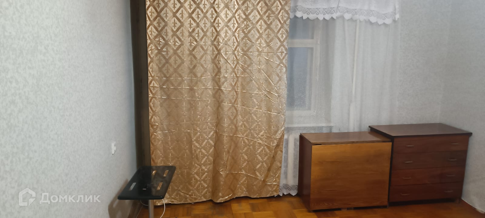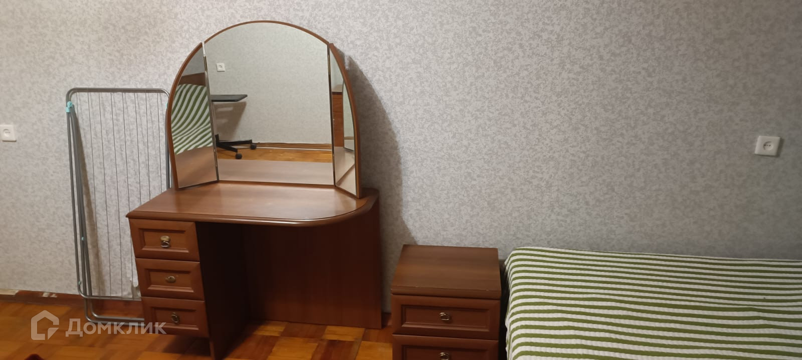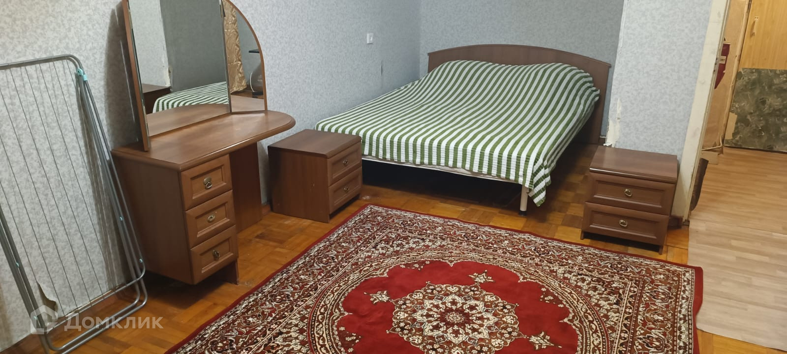 Квартира частично мебелирована, есть кровать, комод, стол с зеркалом, очень большой застеклённый балкон, хорошее расположение квартиры, рядом магазины, аптеки, остановки общественного транспорта.