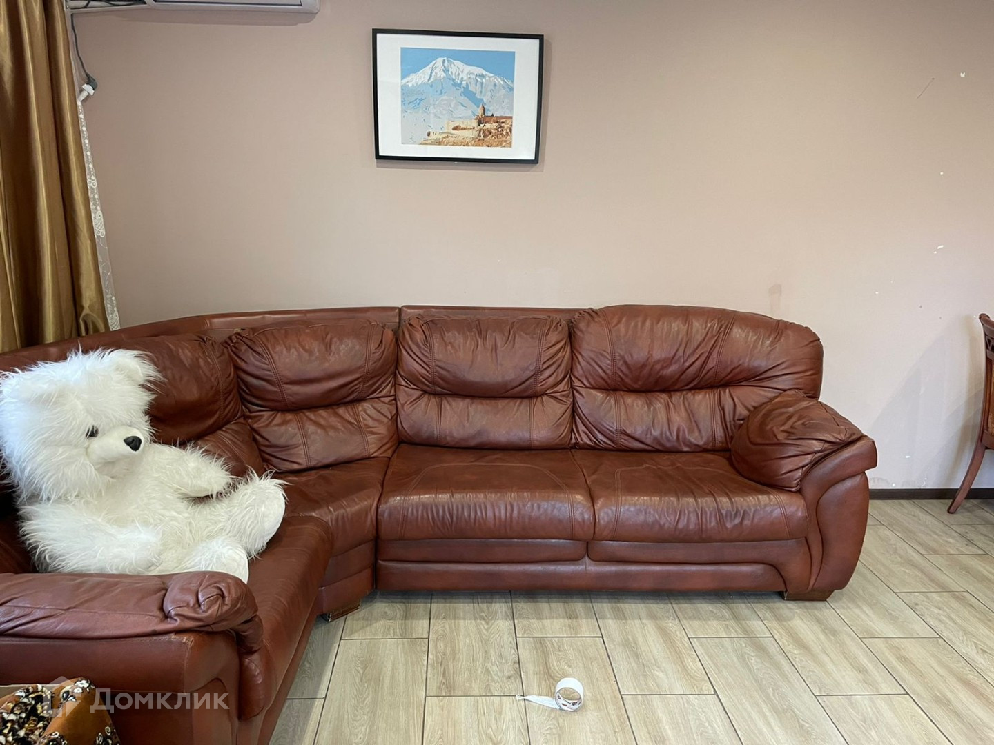 В гостиной большой кожаный диван, телевизор.
