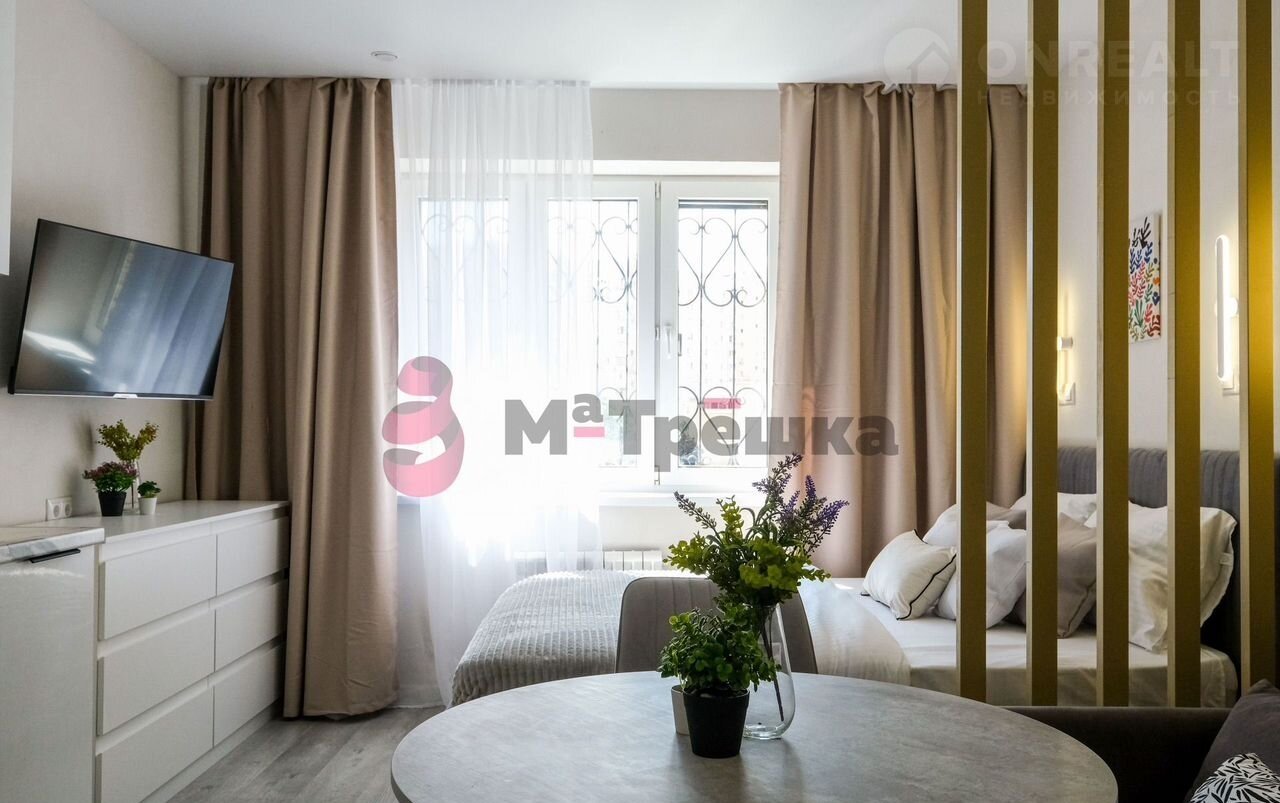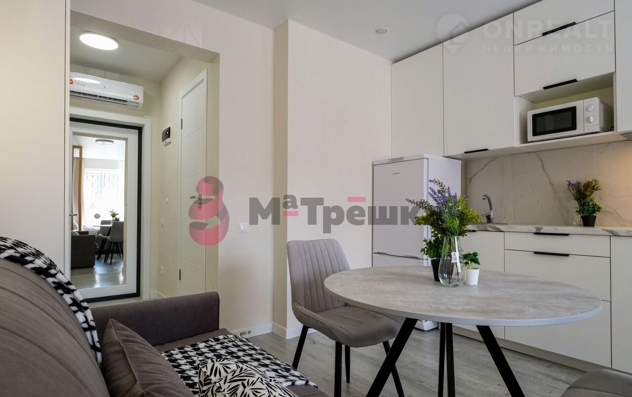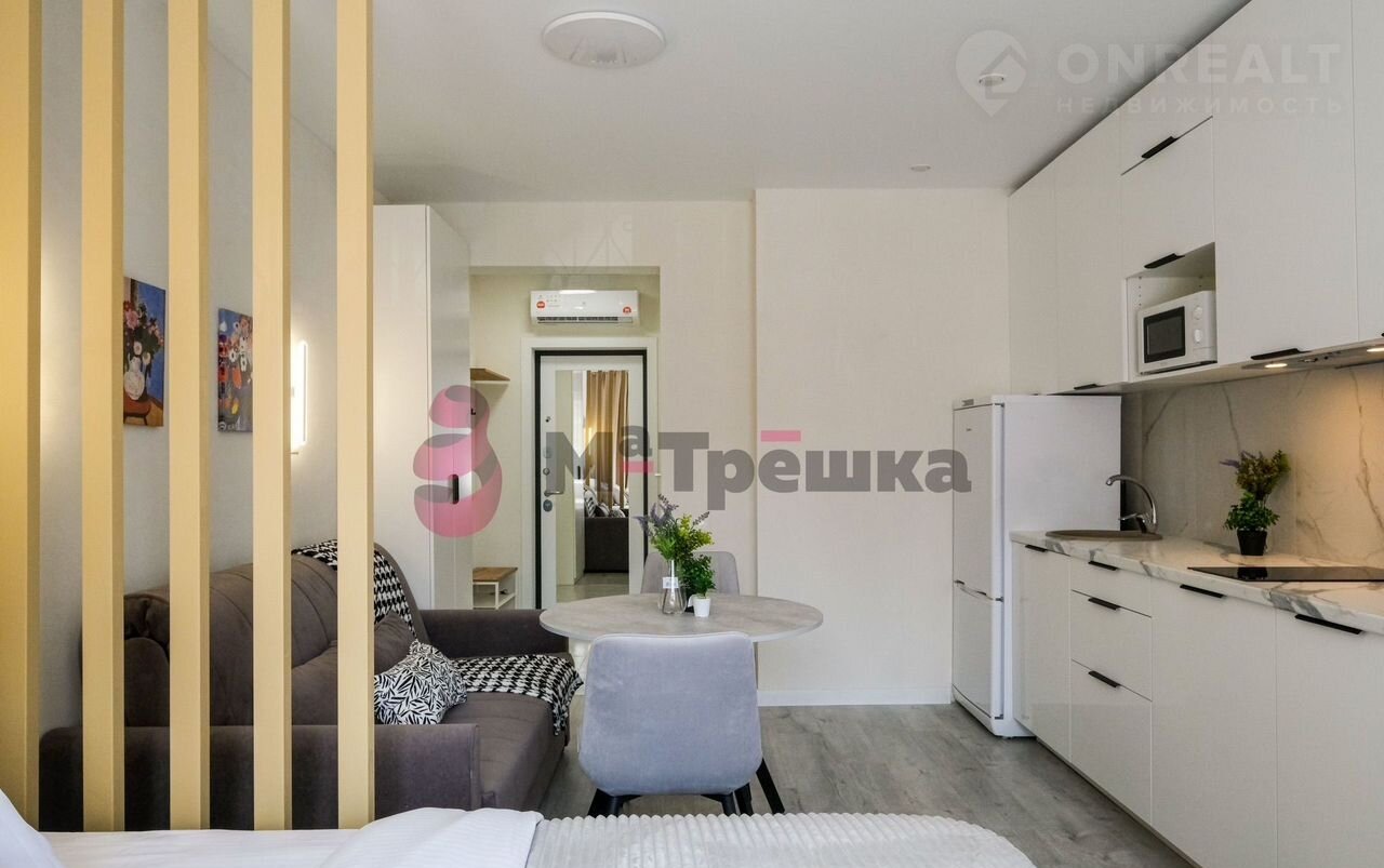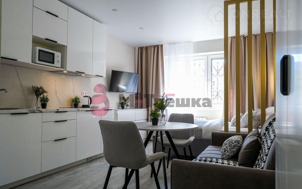 В квартире сделан качественный евроремонт, благодаря которому она выглядит стильно и современно. Пространство студии организовано максимально эффективно: жилое пространство 16 кв. М и компактная кухня 3 кв. м. В наличии вся необходимая техника: кондиционер, холодильник, телевизор и стиральная машина. Мебель есть как на кухне, так и в комнате, поэтому вы сможете сразу заселиться. В санузле установлена душевая кабина.