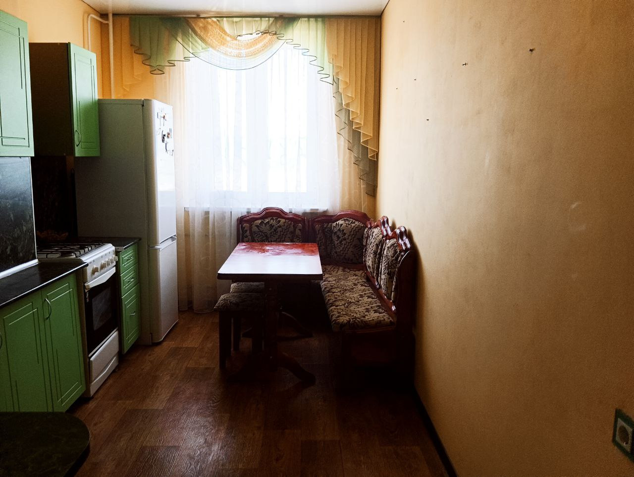 Кухня в ярких тонах, просторная (11 кв.м). со встроенной мебелью и всей необходимой бытовой техникой.