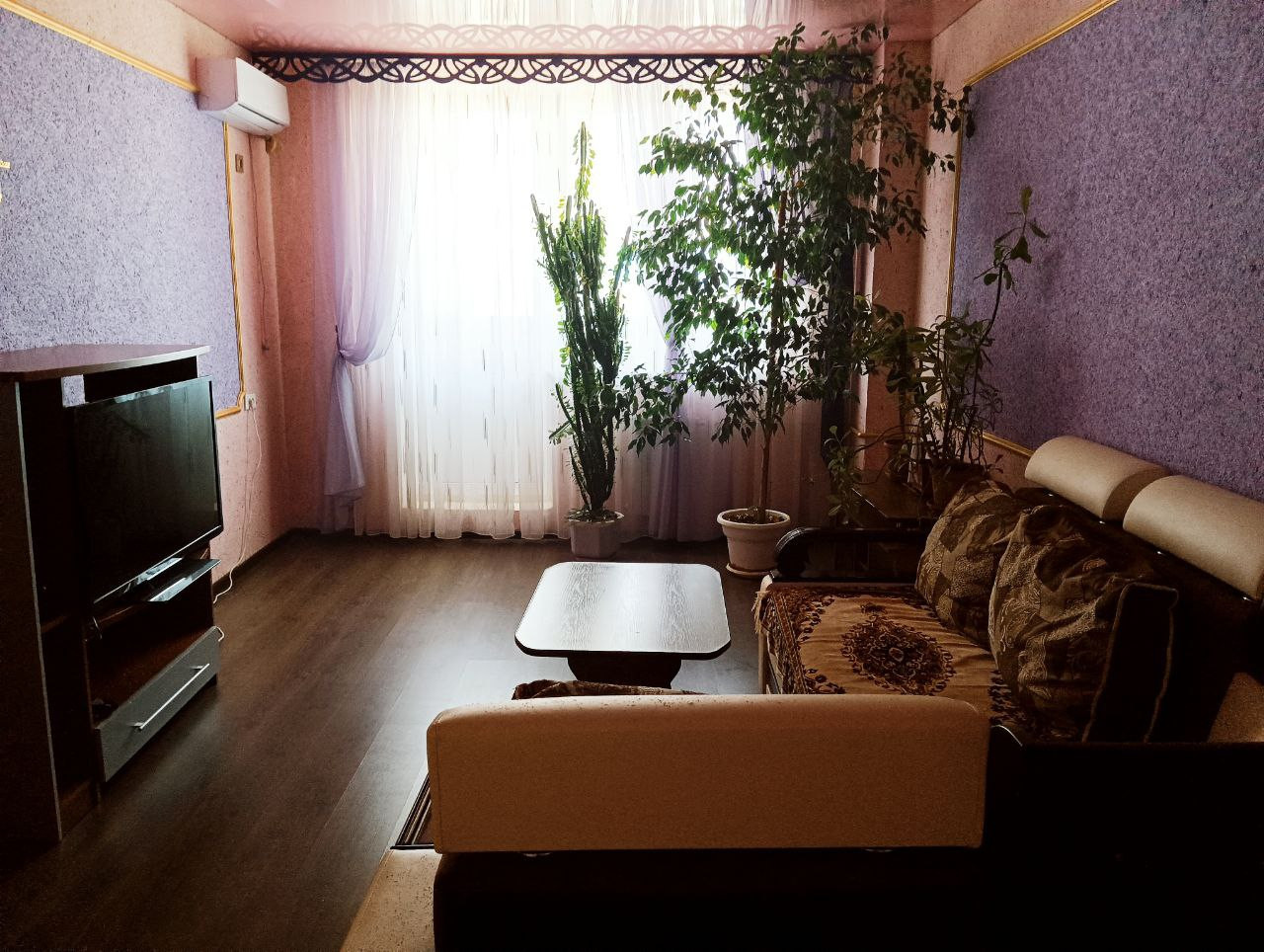 Гостиная просторная, в теплых светлых тонах (21 кв.м.) с выходом на балкон.