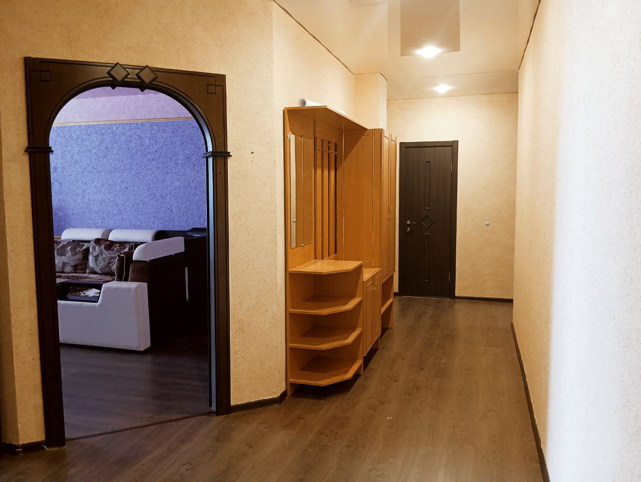 Квартиру объединяет просторная прихожая, которая позволяет вместить объёмную мебель.
