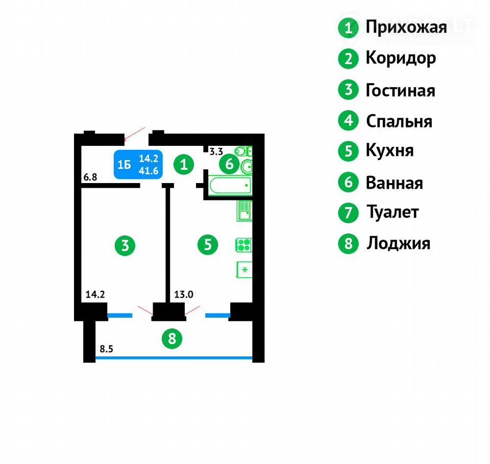 Общая площадь 41.6 м2