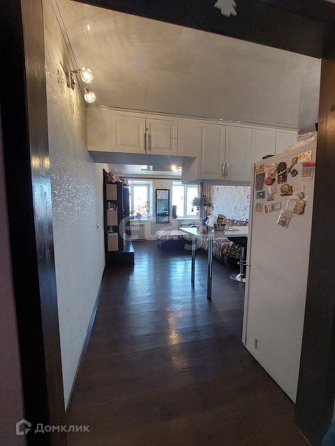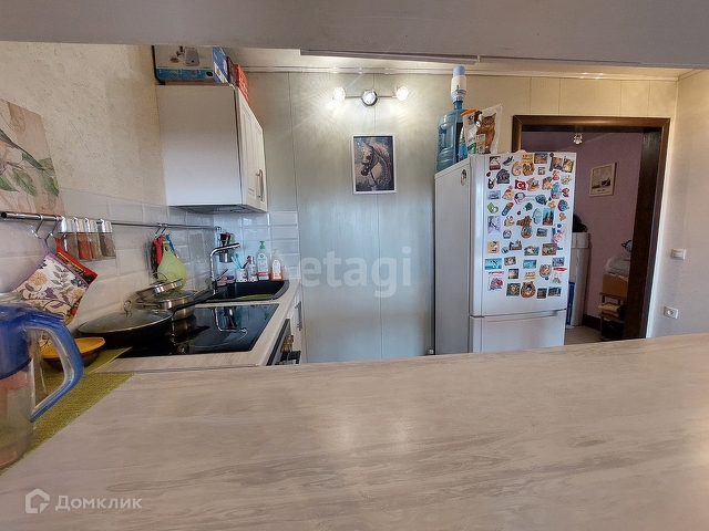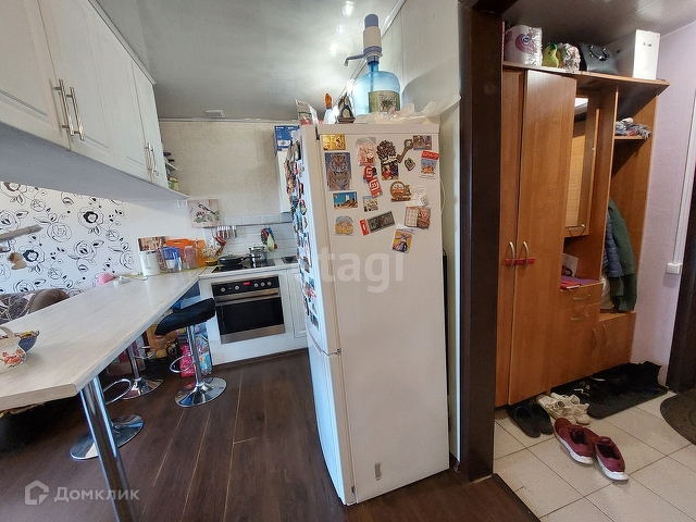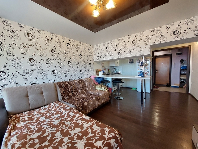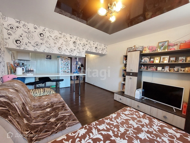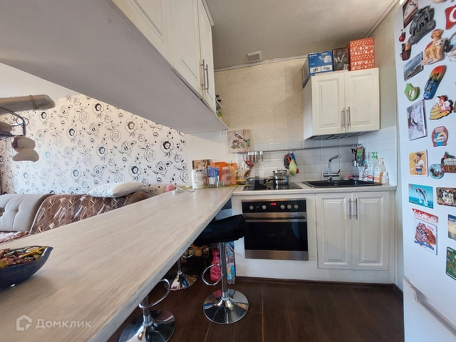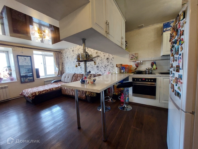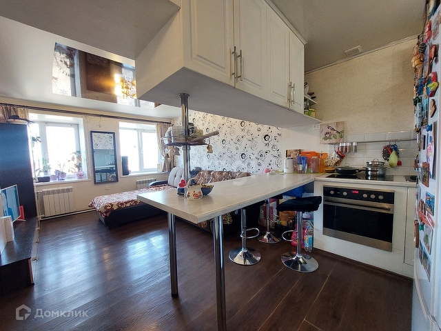 В комнате сделан качественный ремонт, установлена кухня с барной зоной. Есть плита и духовой шкаф.