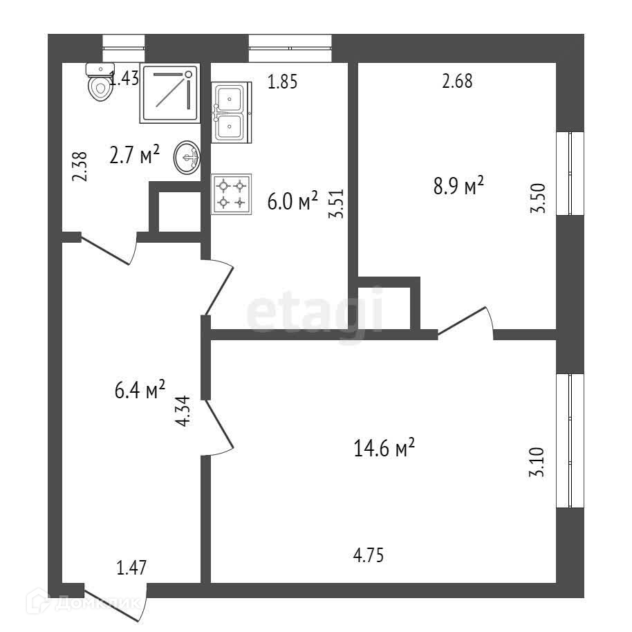 Общая площадь составляет 38,6м², жилая площадь 23,5м², площадь кухни 6м². Окна выходят во двор.