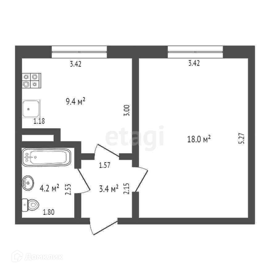 Общая площадь квартиры 35 кв.м. с большой кухней 9.5 кв.м