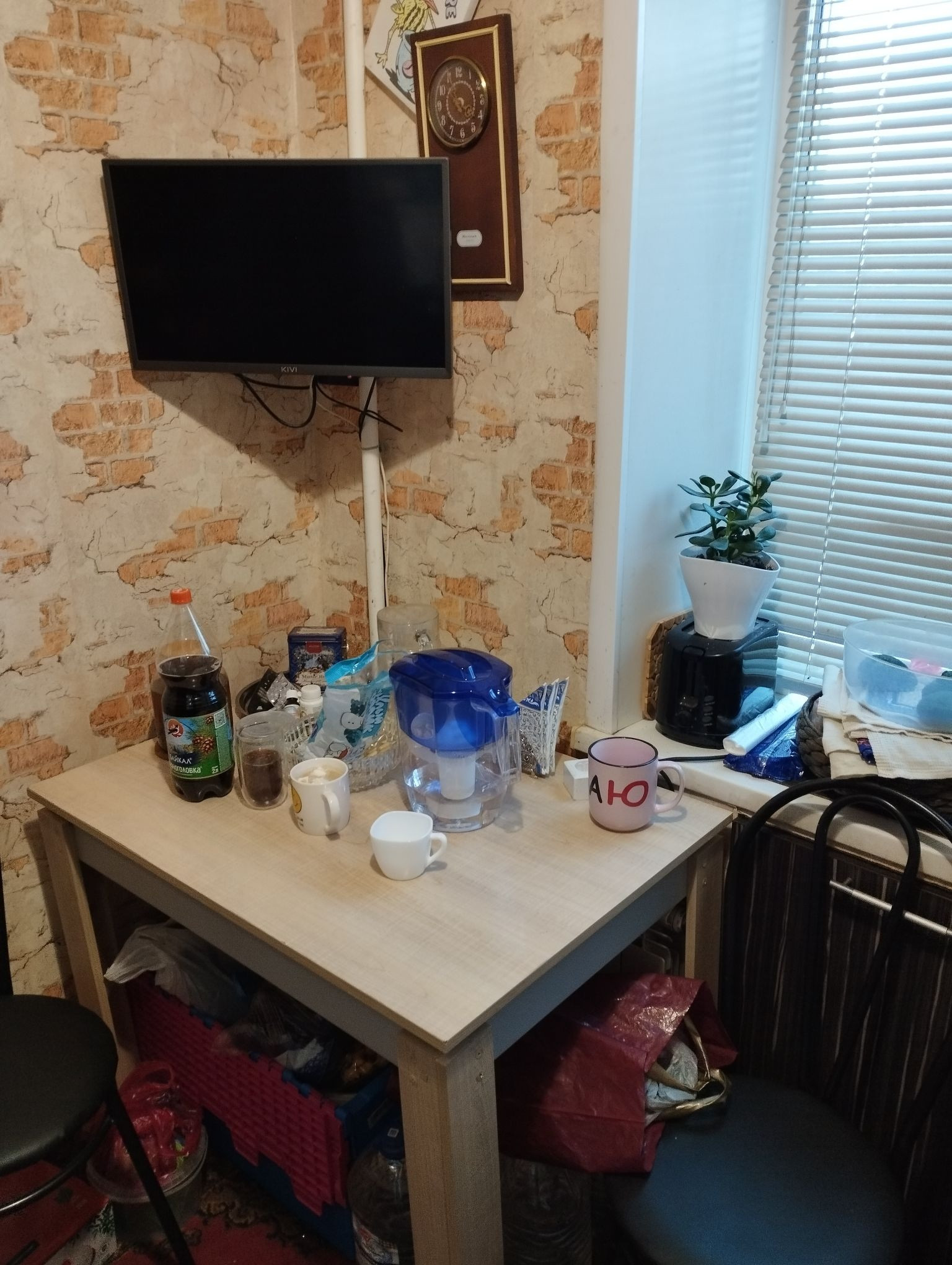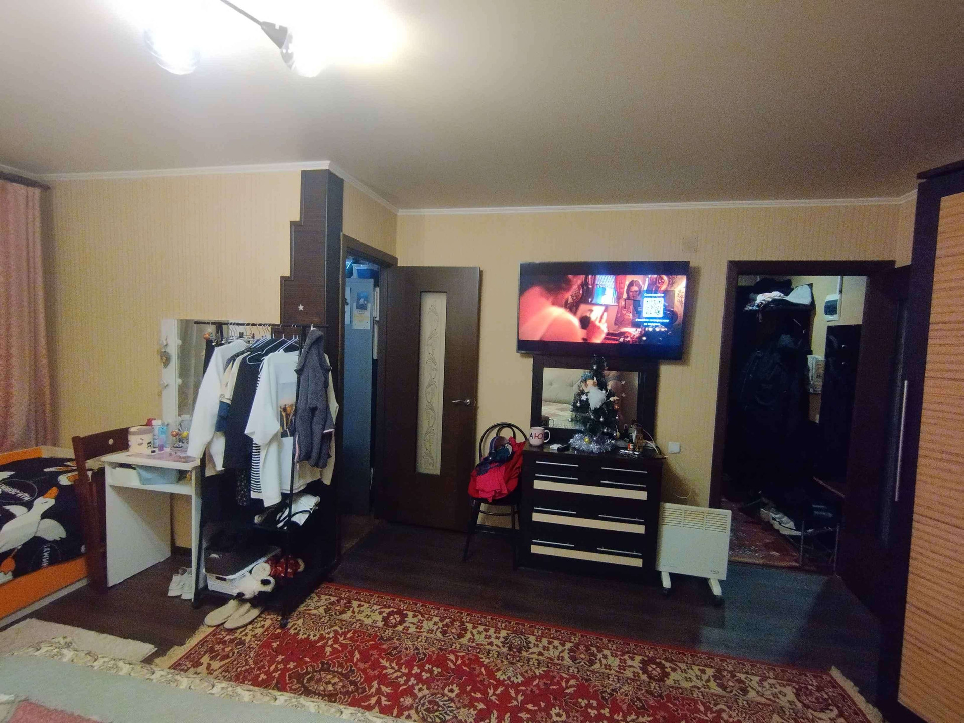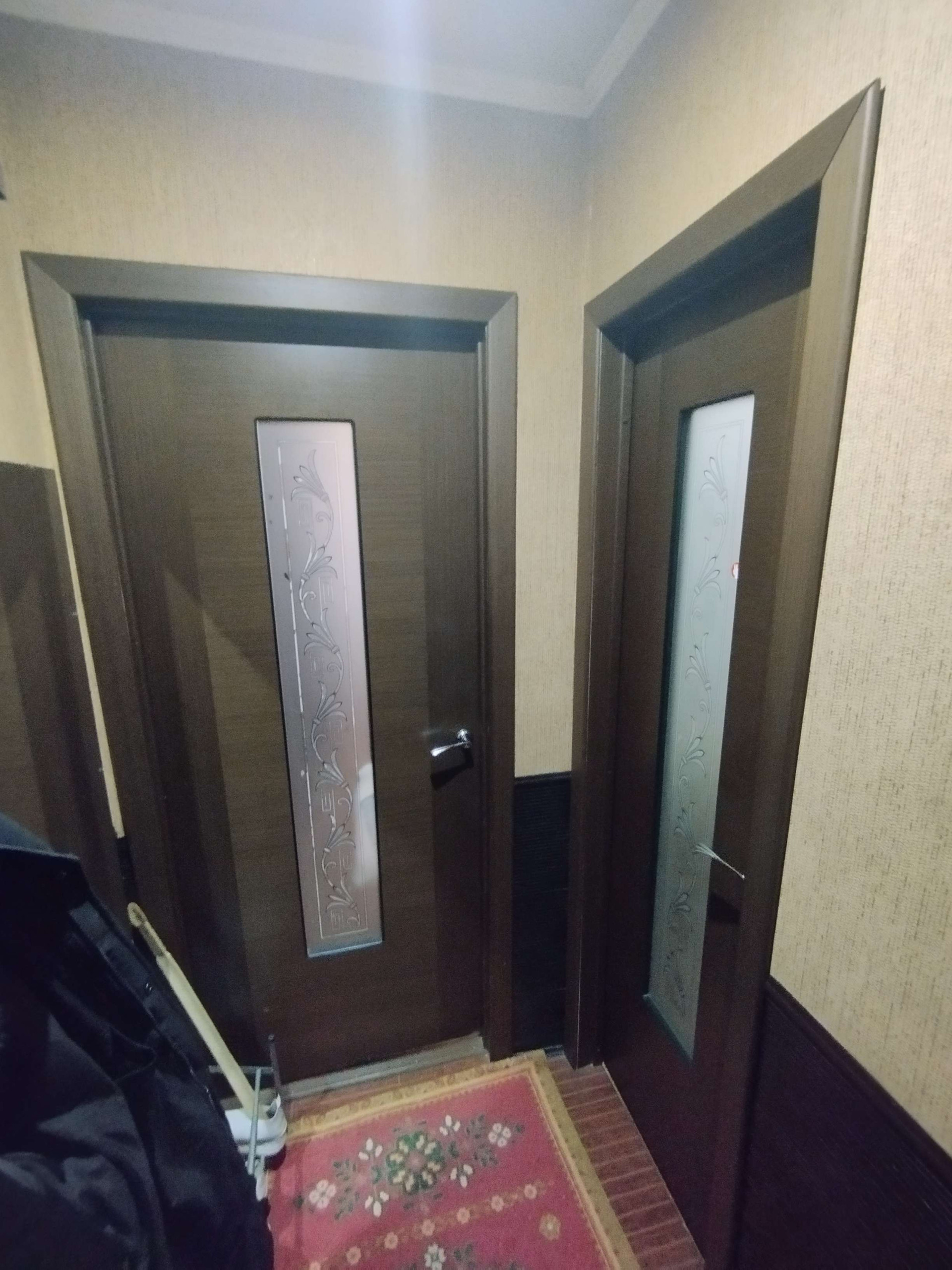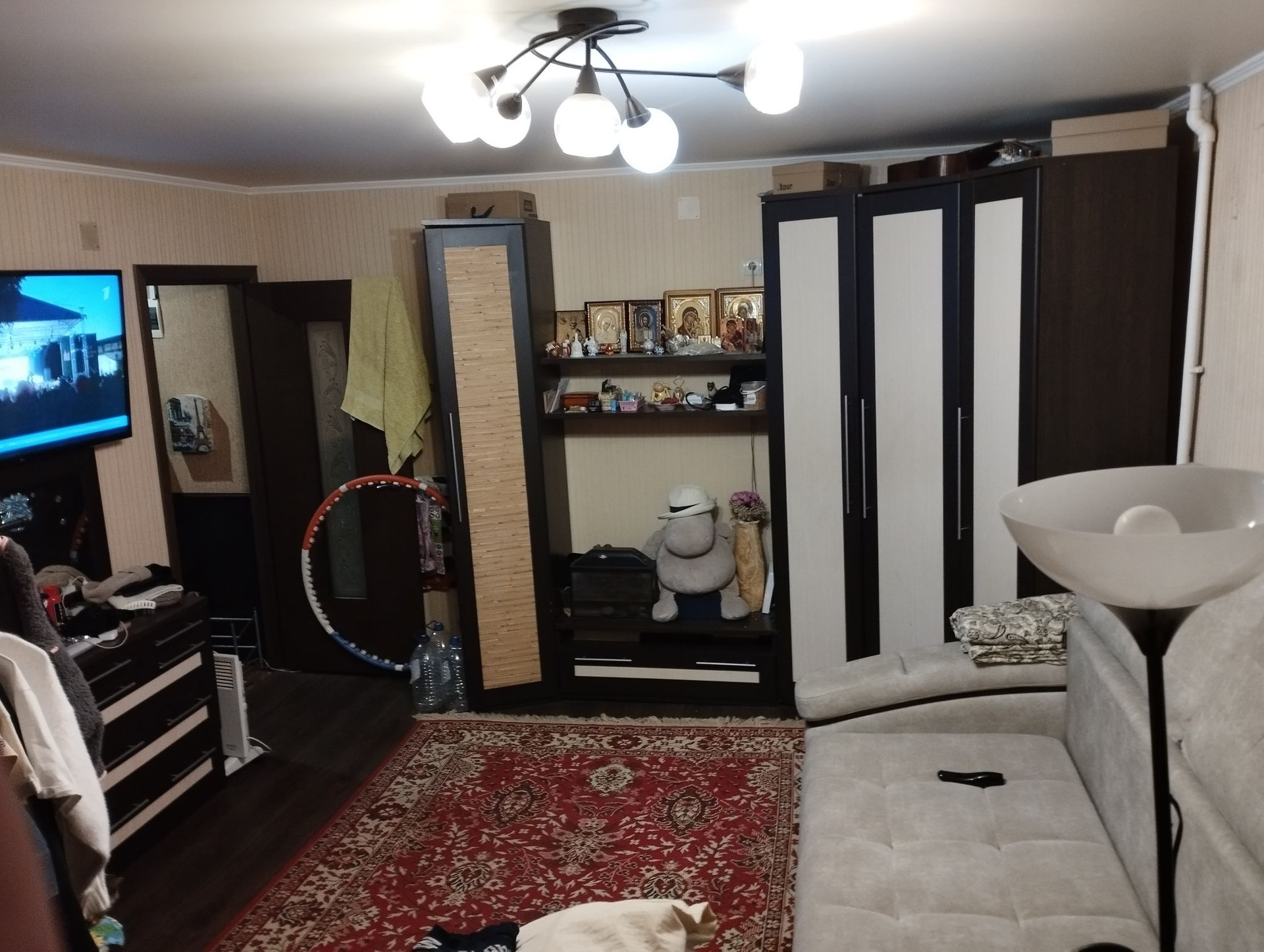 В комнате и кухне-на полу толстый линолеум.