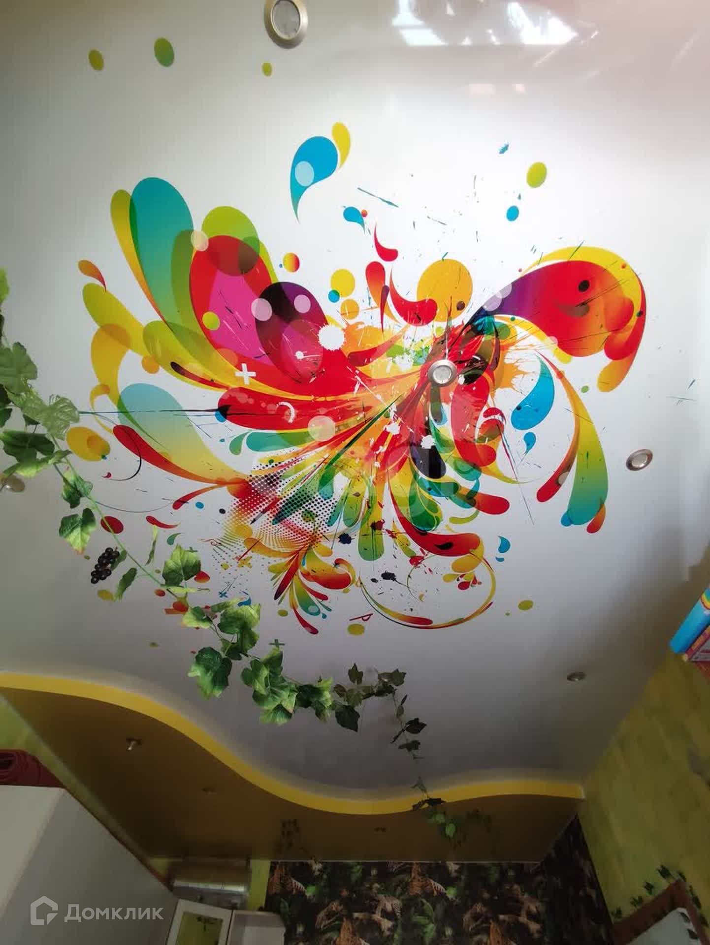 Потолки натяжные во всех комнатах и кухне с фотопечатью.