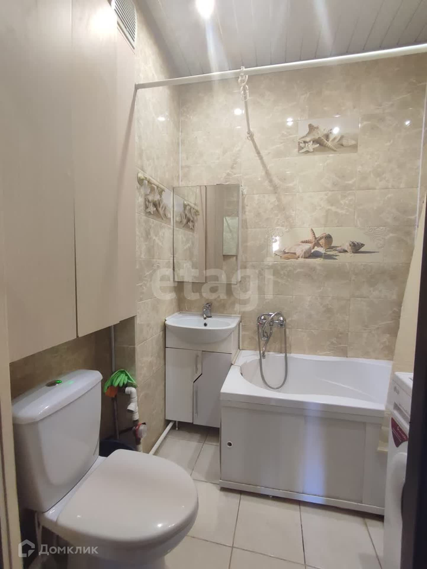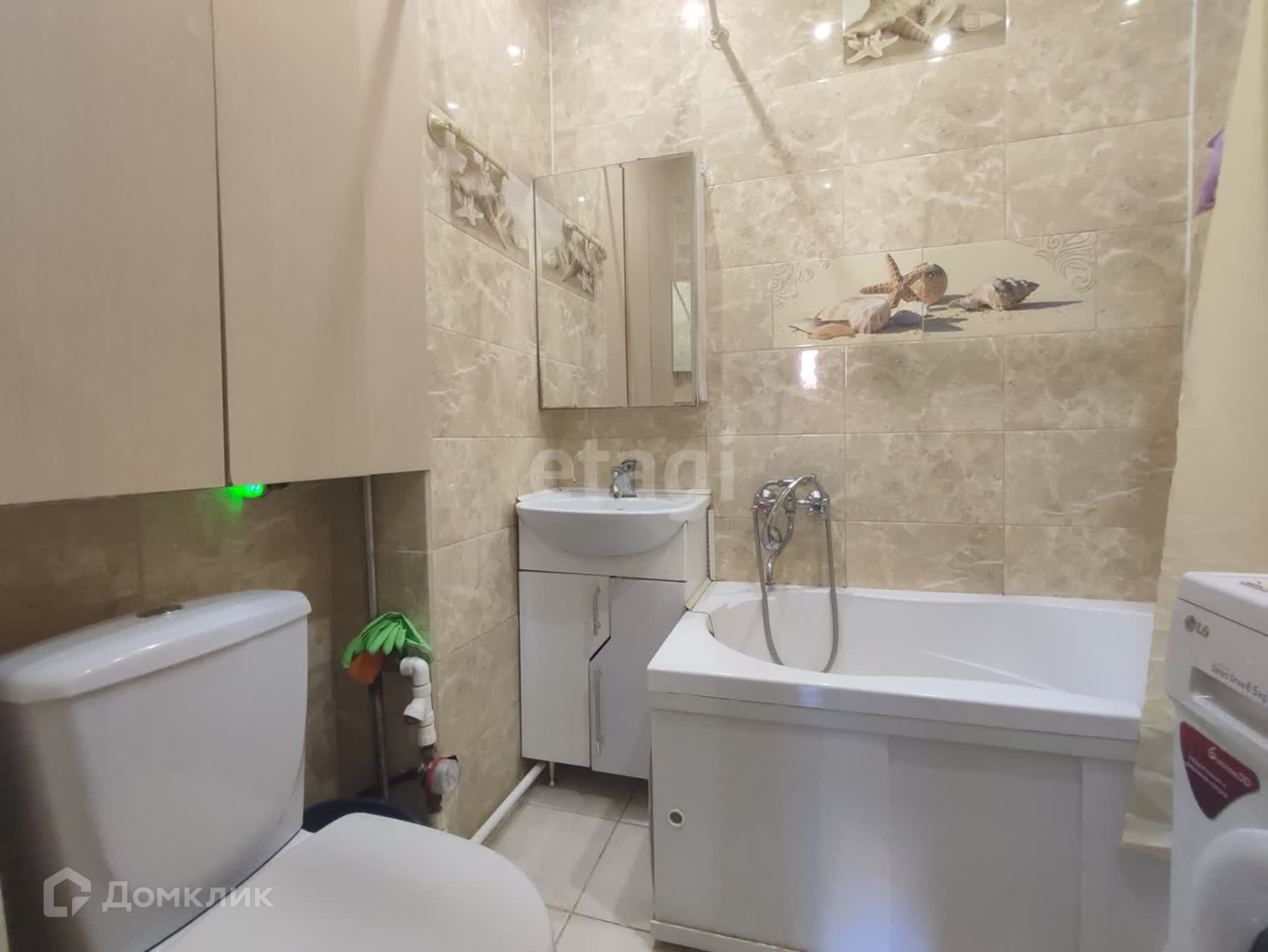 Санузел с новой сантехникой, в плитке, имеет большой встроенный шкаф