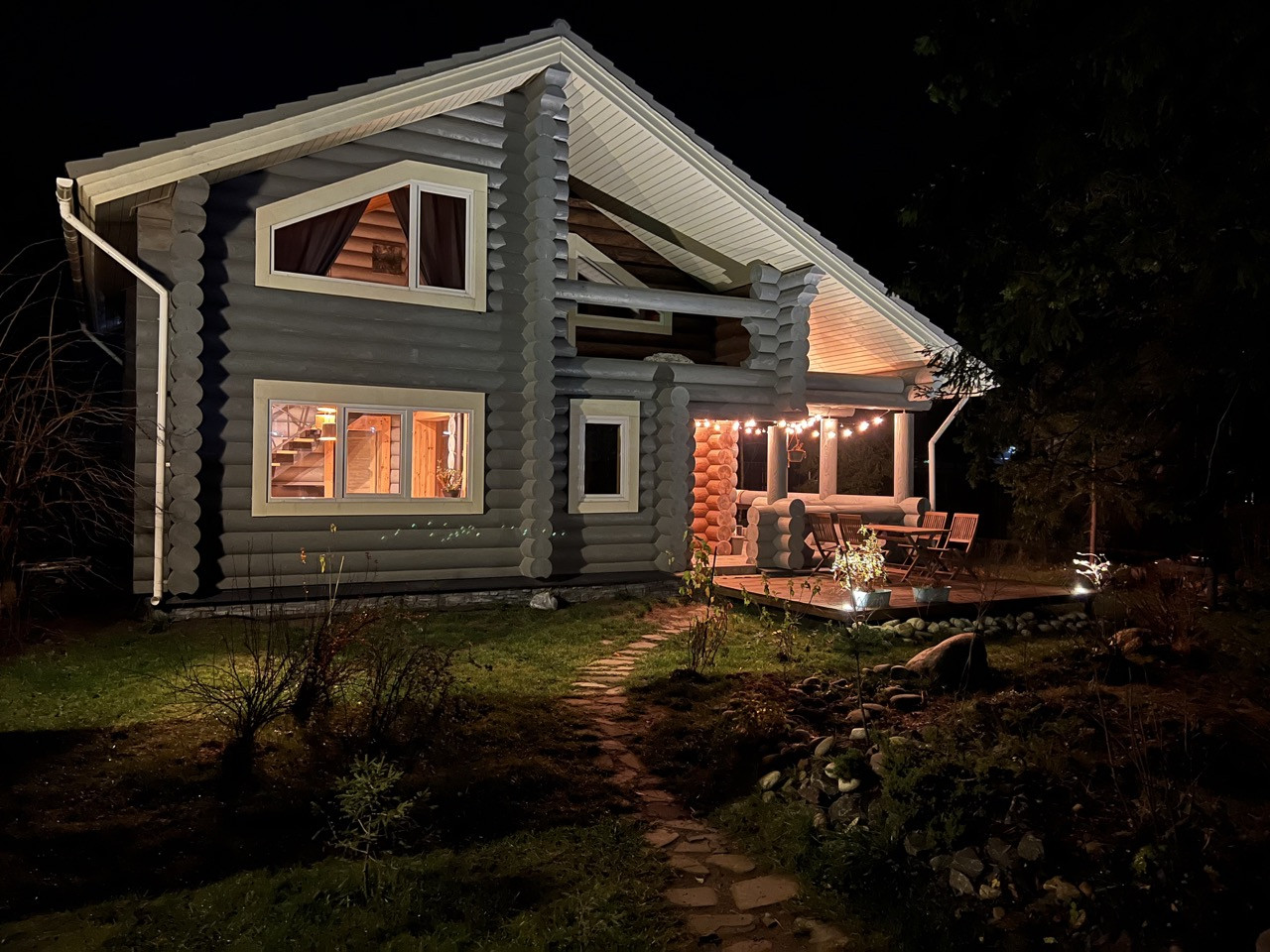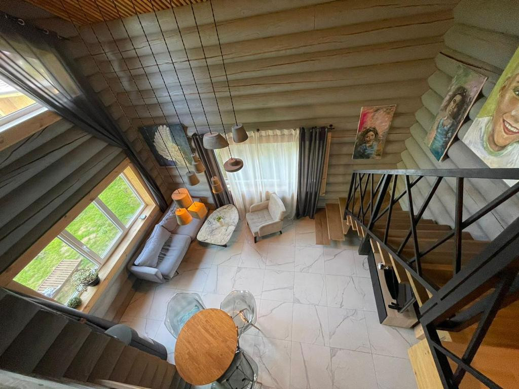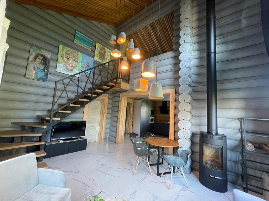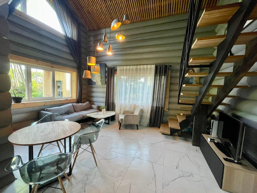 На первом этаже дома находится уютная кухня-столовая-гостиная с большими панорамными окнами, вторым светом, большое крыльцо и терраса, отдельный вход в прачечную и котельную, спальня и просторный сан-узел.