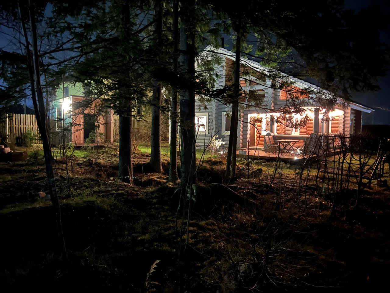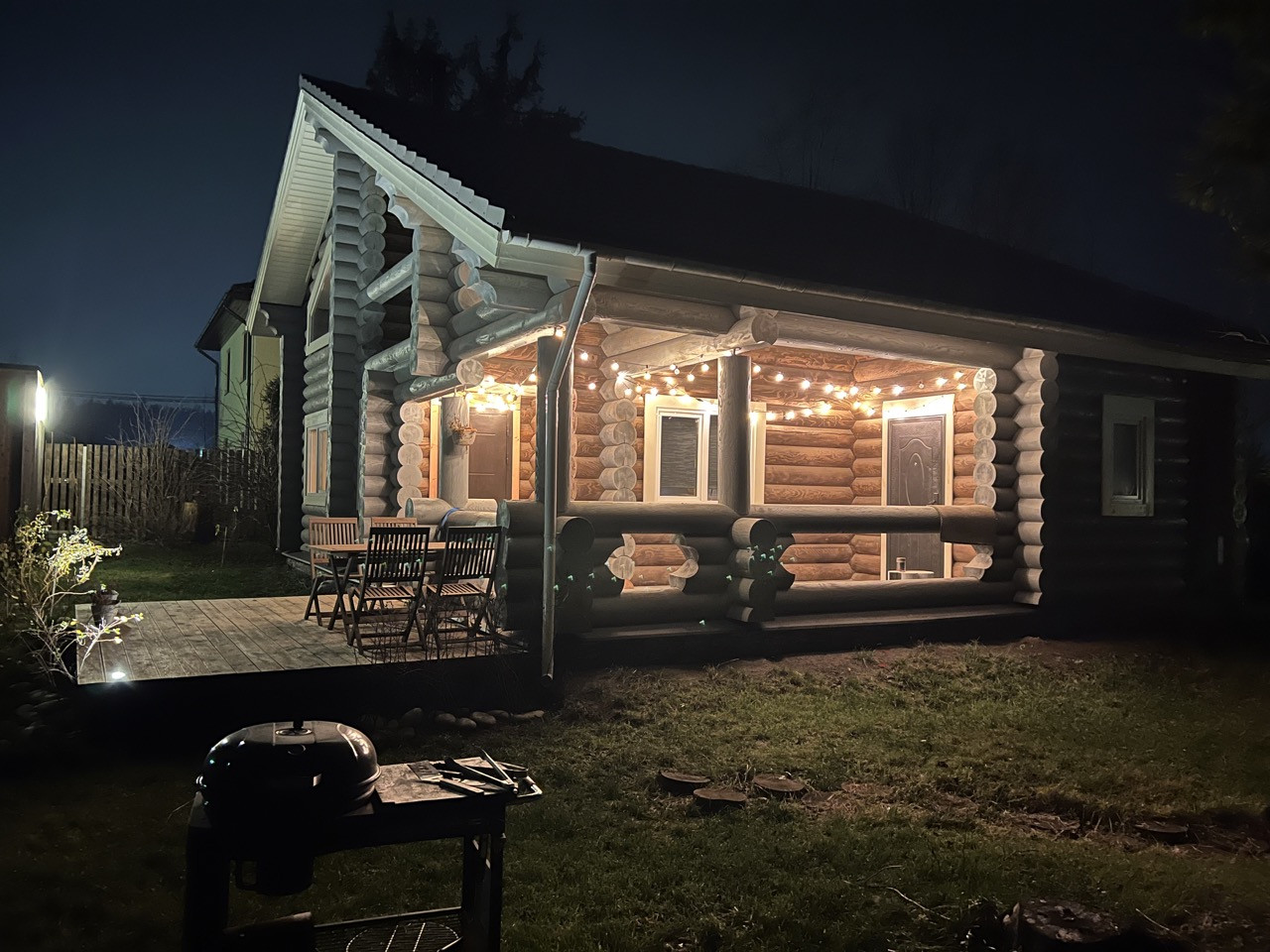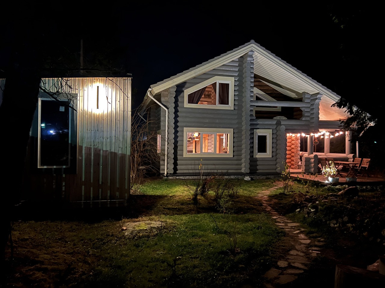 На первом этаже дома находится уютная кухня-столовая-гостиная с большими панорамными окнами, вторым светом, большое крыльцо и терраса, отдельный вход в прачечную и котельную, спальня и просторный сан-узел.