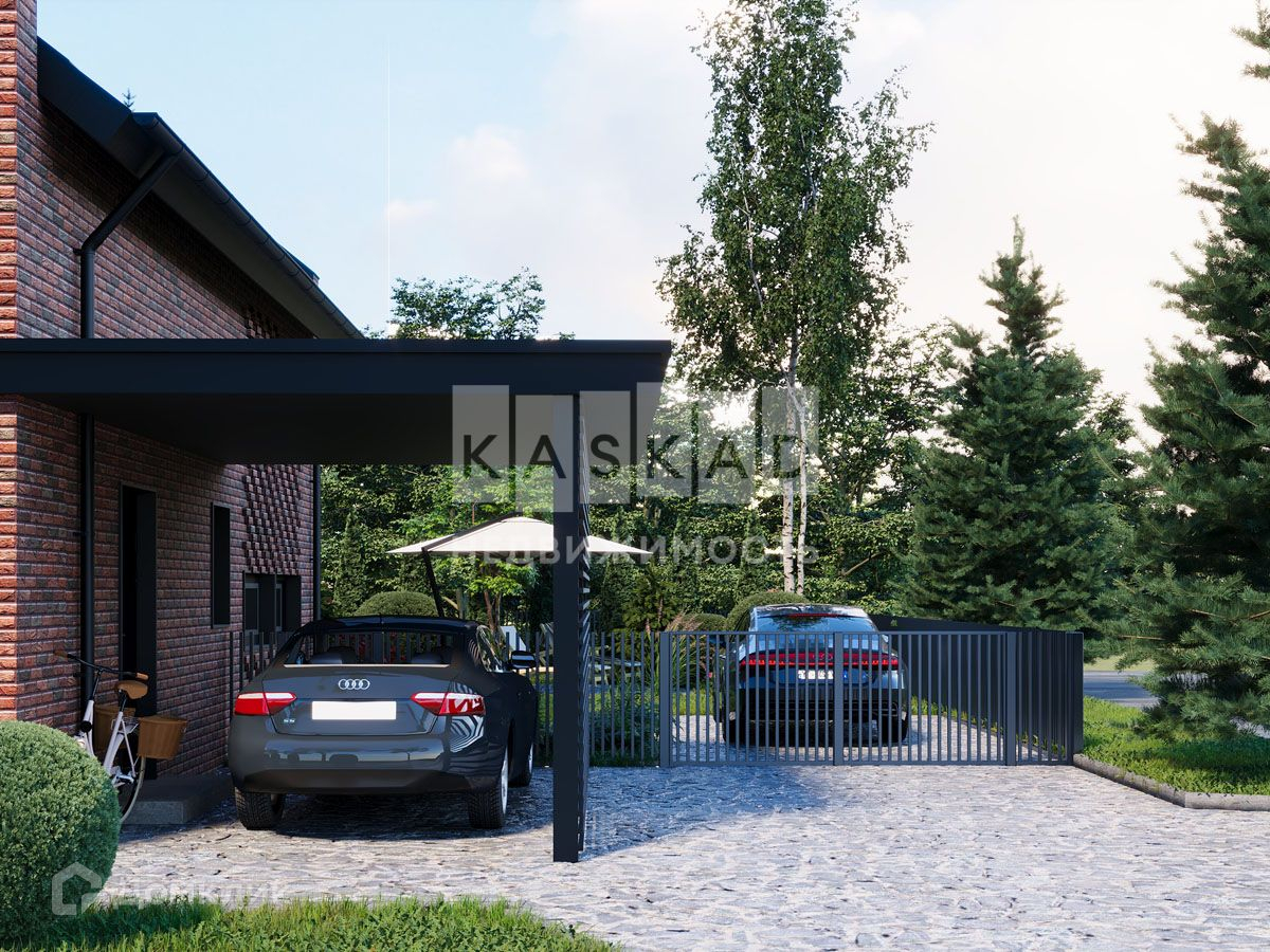 Индивидуальные парковочные места: навесы у каждого коттеджа и гостевая стоянка.