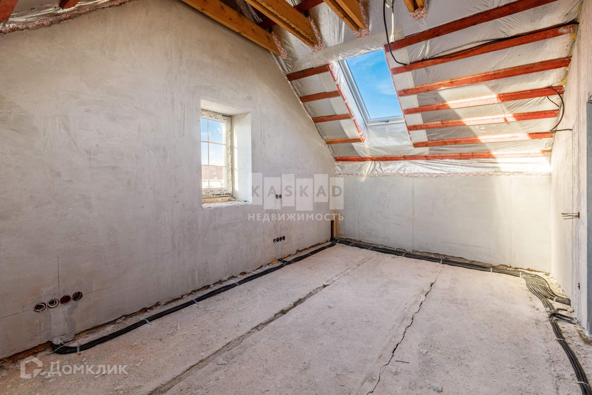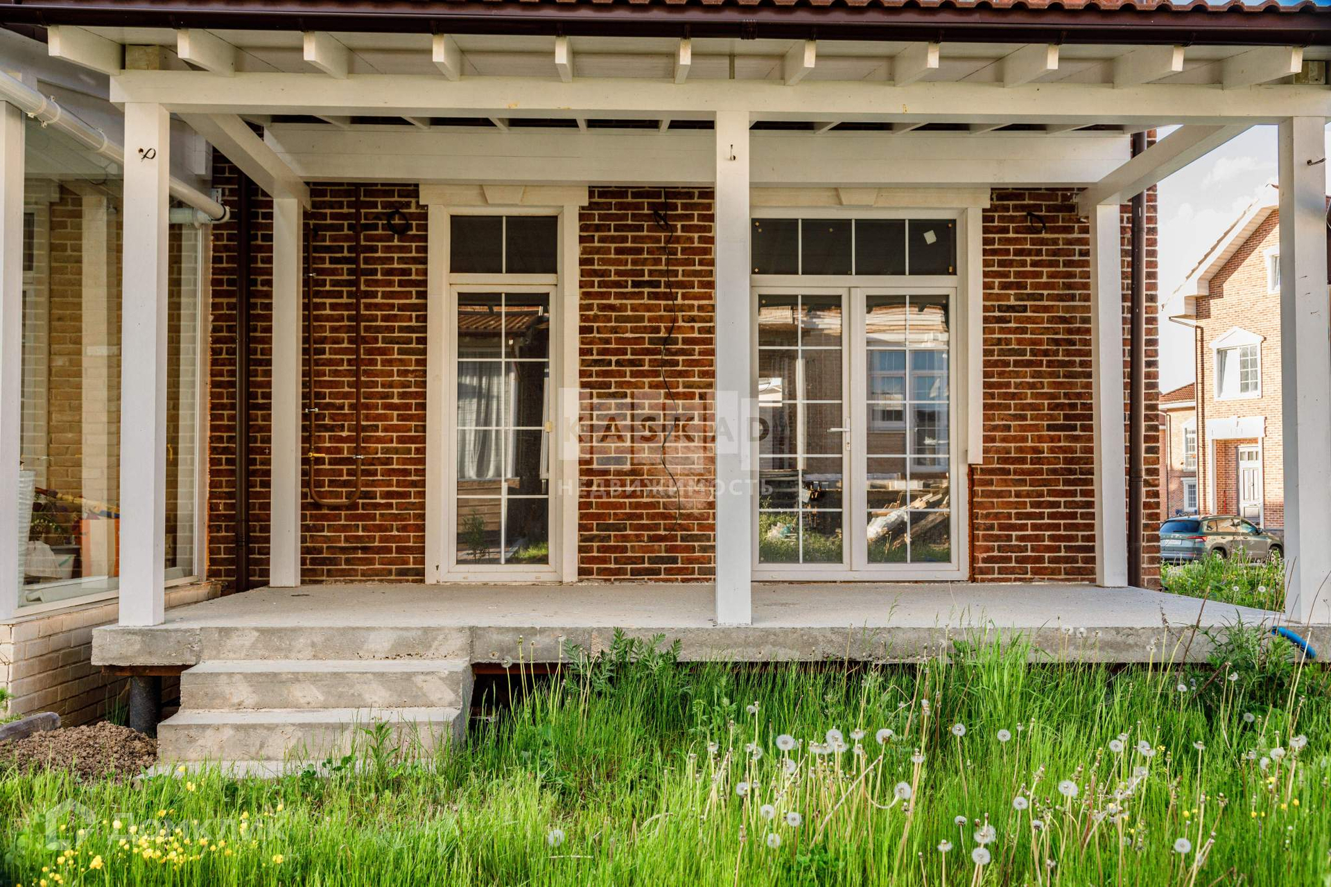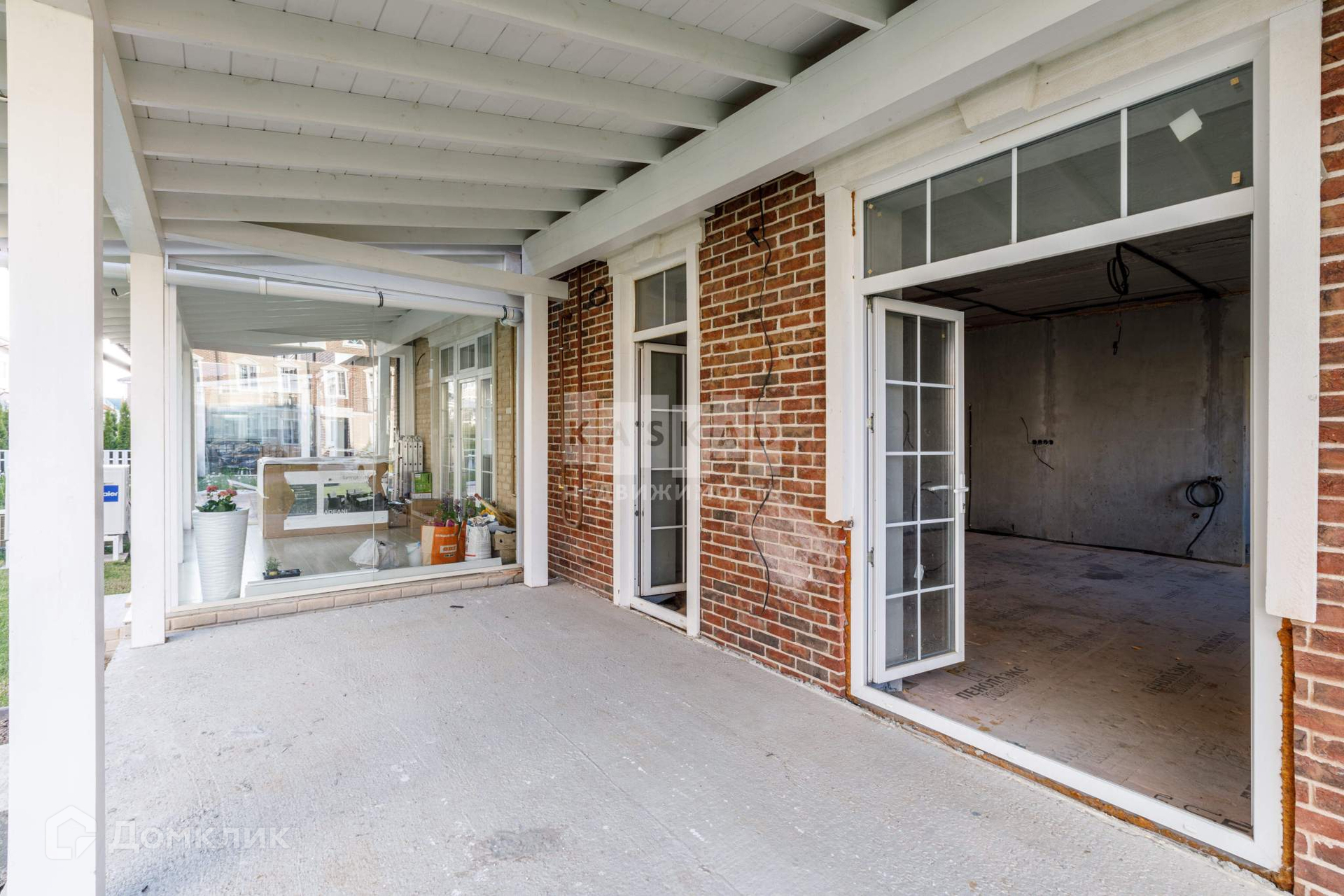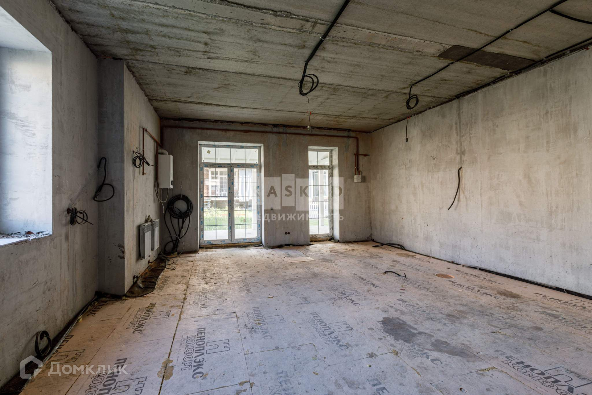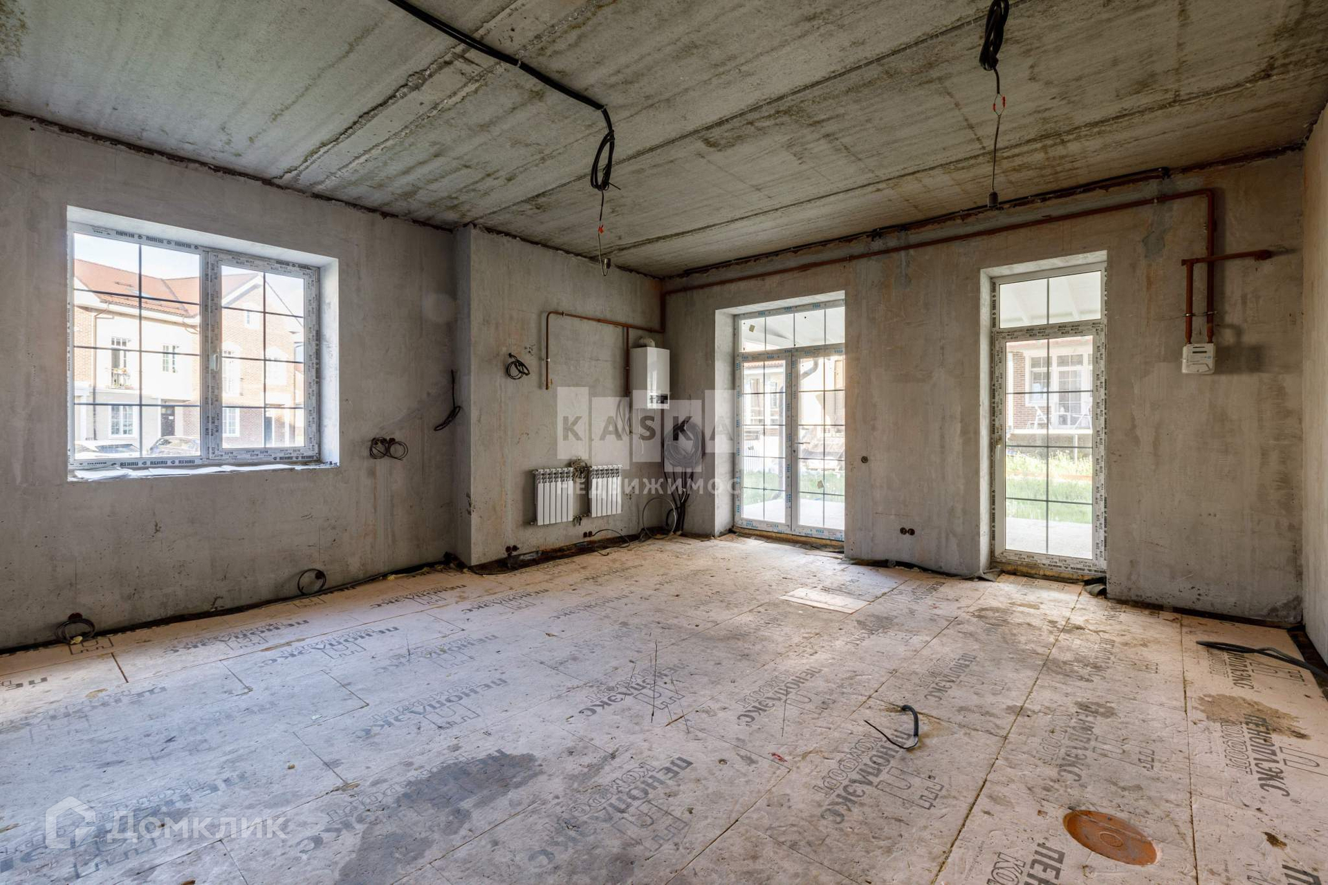 Таунхаус со значительно выполненной предчистовой отделкой: установлена бетонная лестница, утеплена кровля, установлены кровельные окна, смонтированы межкомнатные перегородки, разведена электрика согласно проекту, стены оштукатурены, в дом заведён газ, установлен газовый котёл, со стороны участка возведена терраса с навесом.