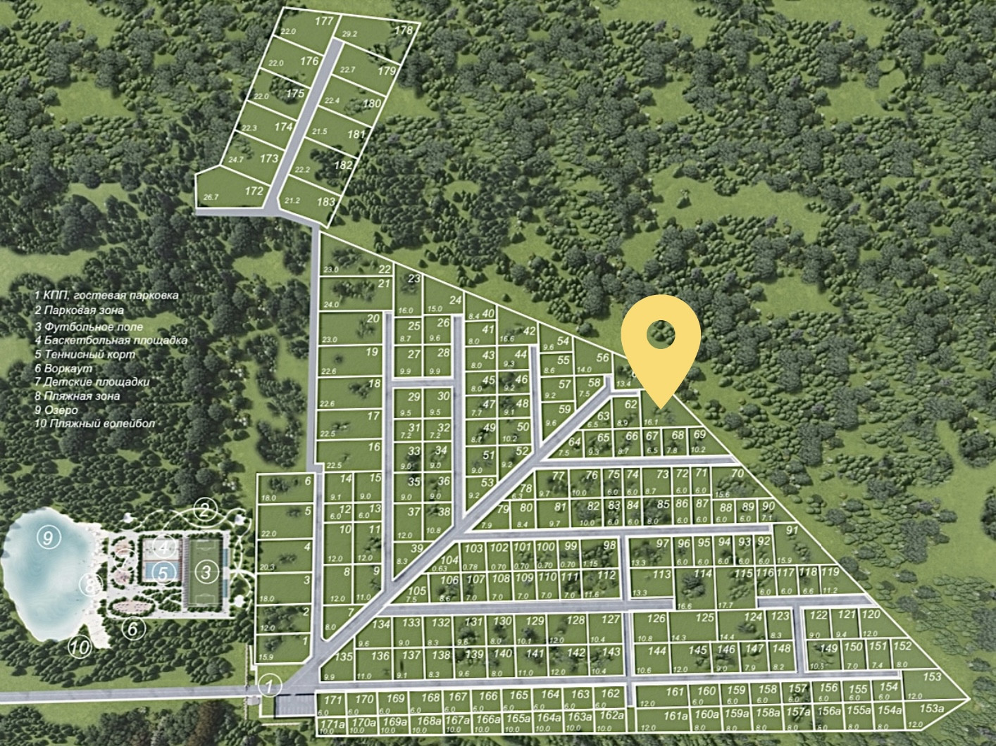 Посёлок состоит из 3 очередей, 2 из которых уже сданы. Многие участки раскуплены и уже застроены. 3 очередь имеет отдельный подъезд и КПП. К посёлку подведены коммуникации, установлены системы видеонаблюдения и охраны, а для обслуживания территории есть сервисная служба, которая отвечает за комфортное проживание жителей поселка.