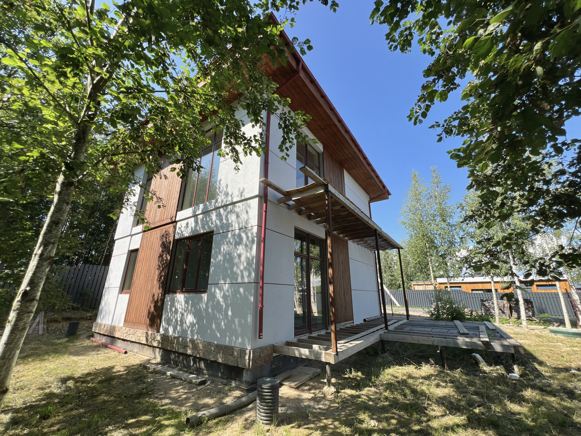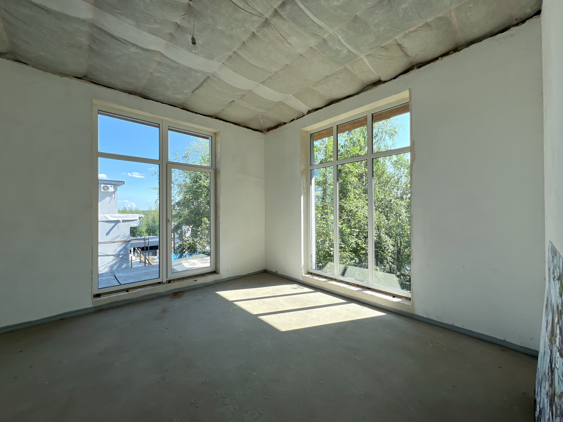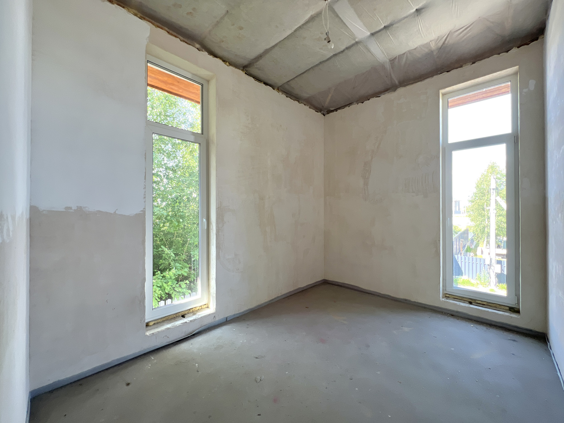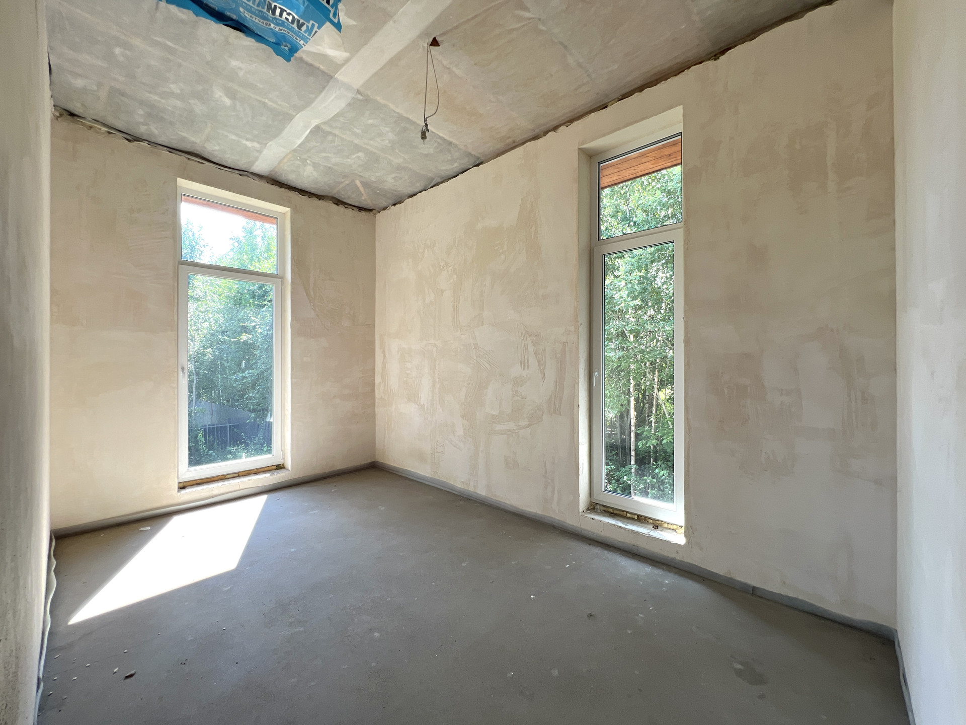 Внутренняя отделка дома - черновая отделка. Окна в доме — двухкамерные пластиковые стеклопакеты. На входе установлена цельнометаллическая дверь с терморазрывом. Крыша дома — плоская, повышенной устойчивости к сильным ветрам, покрыта металлической черепицей.