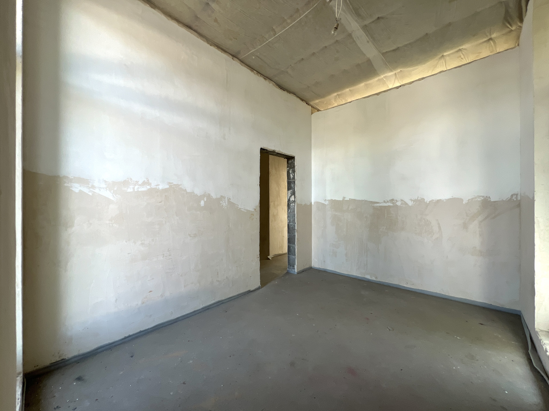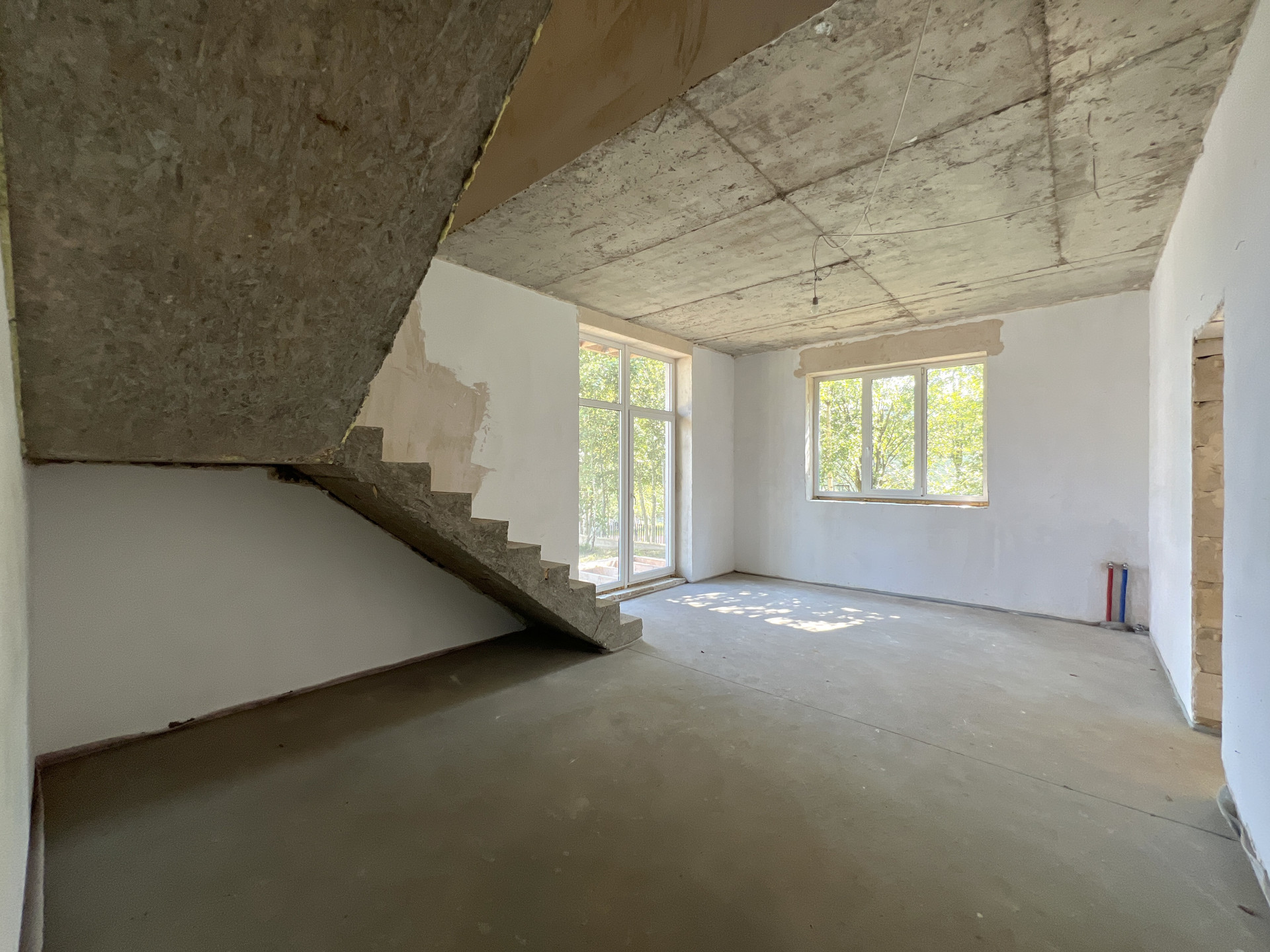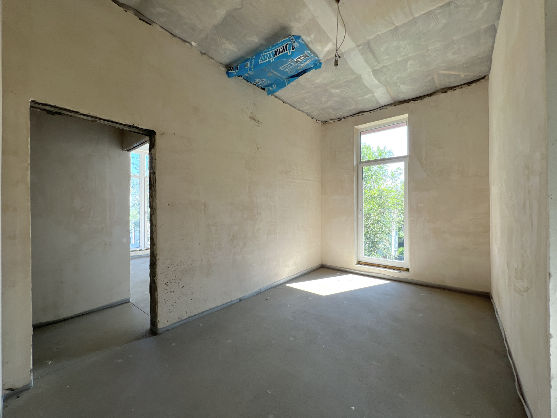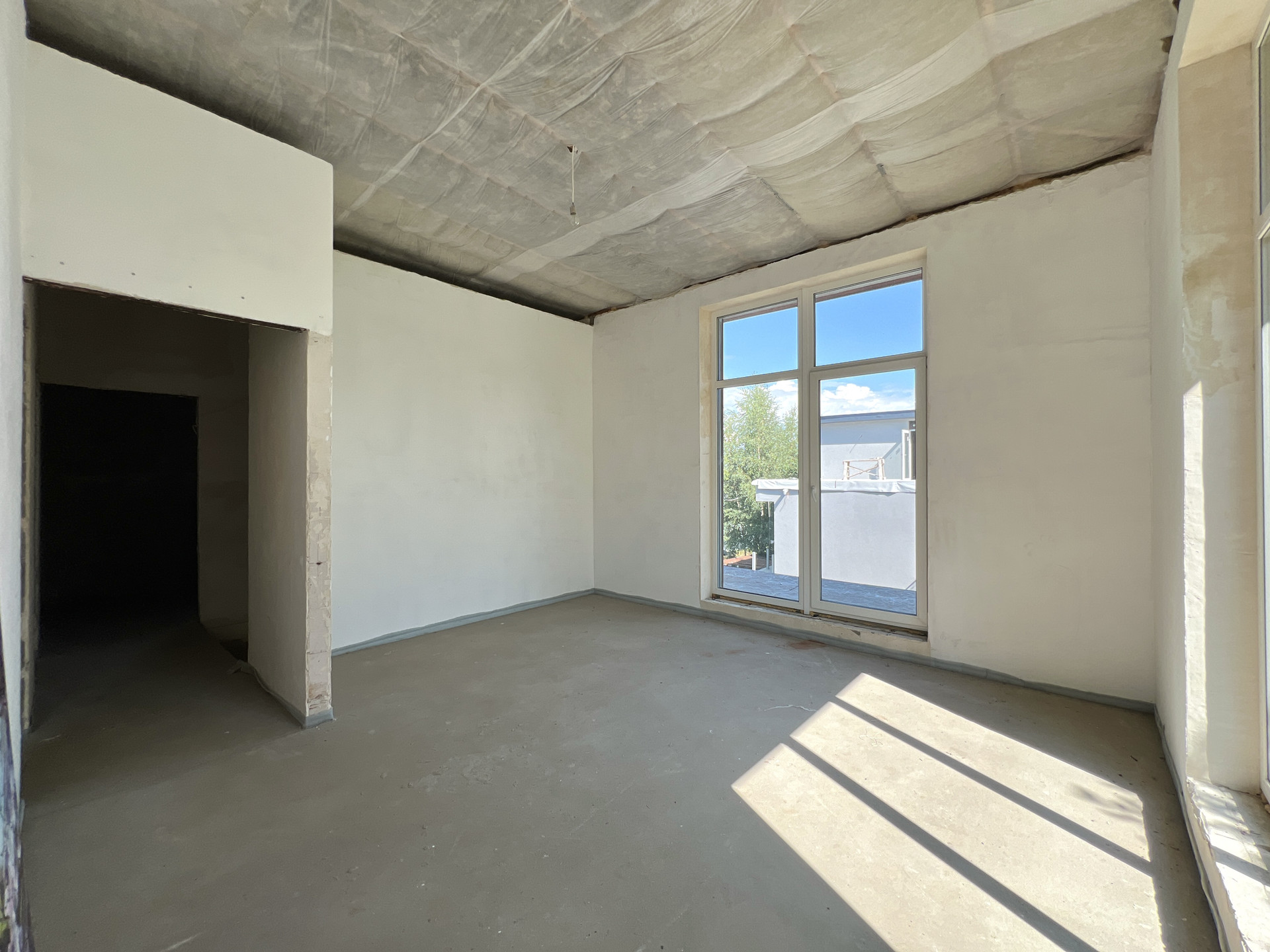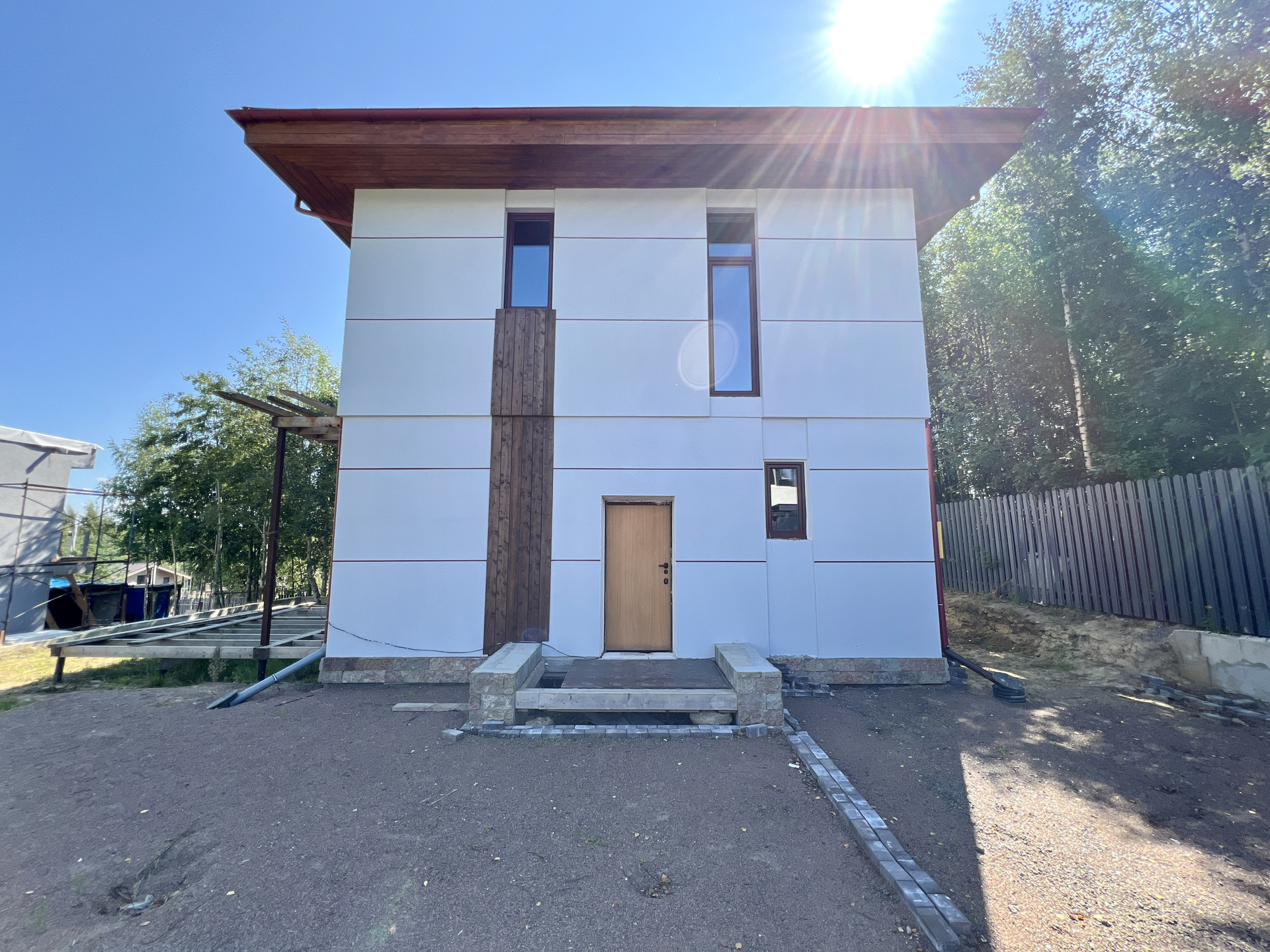 Внутренняя отделка дома - черновая отделка. Окна в доме — двухкамерные пластиковые стеклопакеты. На входе установлена цельнометаллическая дверь с терморазрывом. Крыша дома — плоская, повышенной устойчивости к сильным ветрам, покрыта металлической черепицей.
