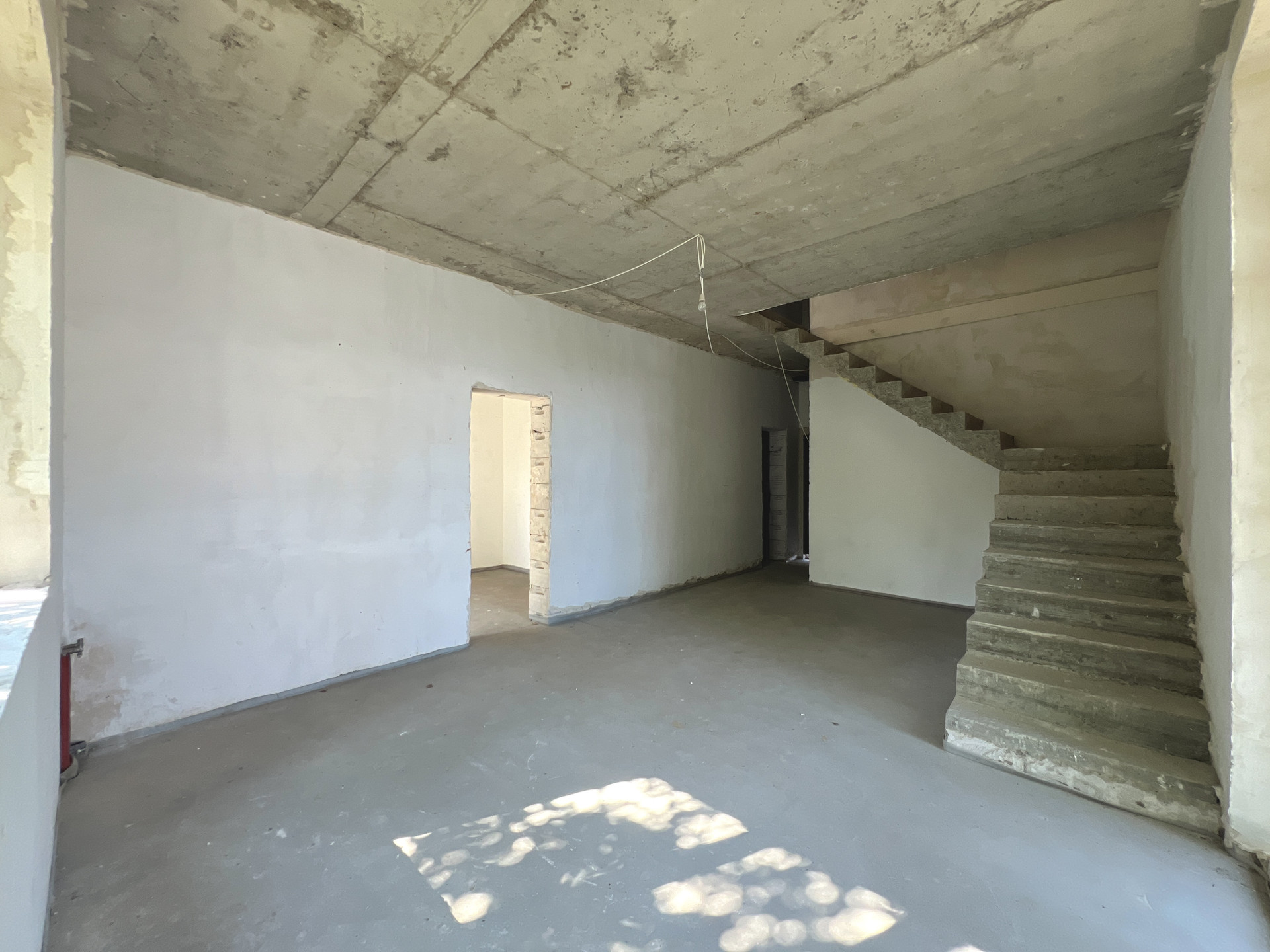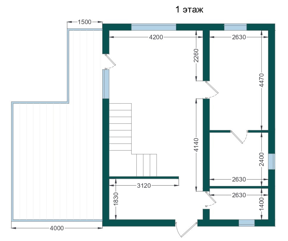 Фундамент дома выполнен из железобетонной плиты толщиной 250 мм. Стены дома построены из газобетона толщиной 300 мм с утеплением 150 мм. Фасад отделан по технологии мокрый фасад.