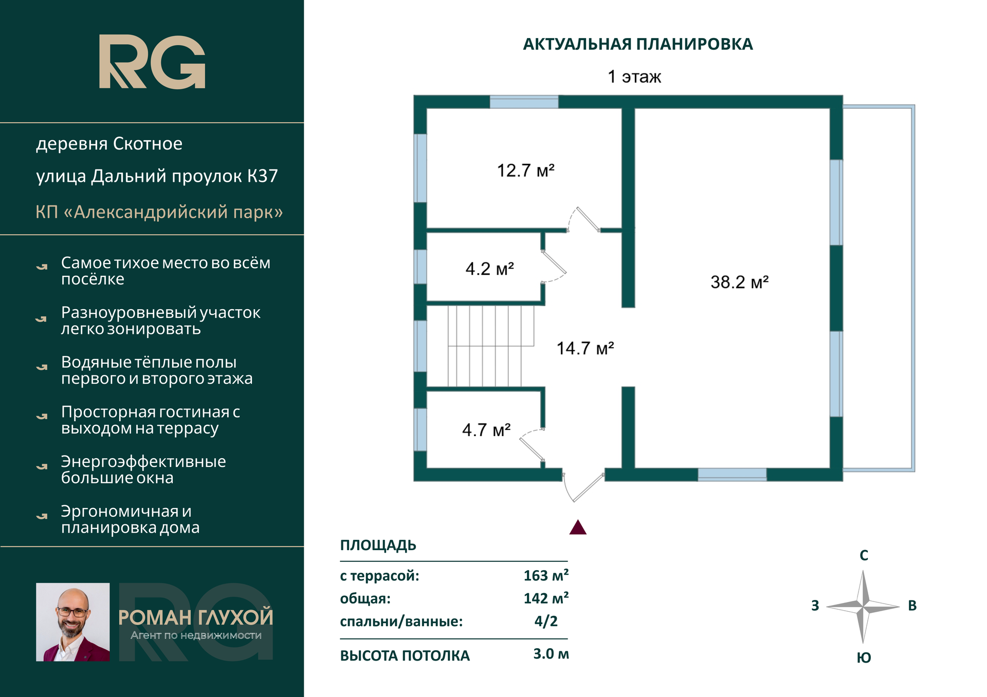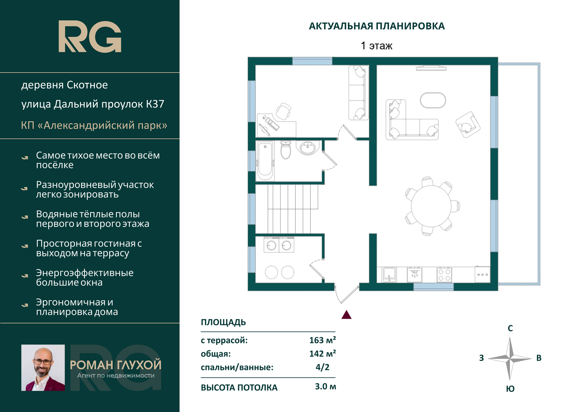 В коттеджном посёлке класса комфорт, "Александрийский парк", мы предлагаем вам купить дом площадью 163 квадратных метра. Дом построен в 2023 году. Участок правильной формы, с парковочной площадкой для автомобиля и небольшим перепадом высот. Межевание выполнено. Есть возможность взять ипотеку или использовать материнский капитал.