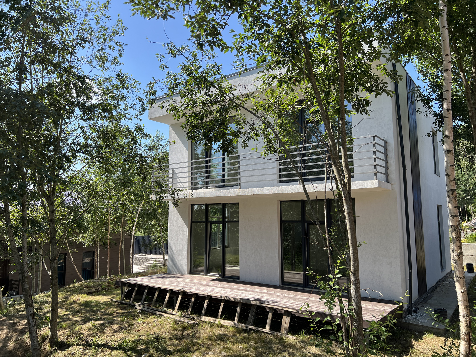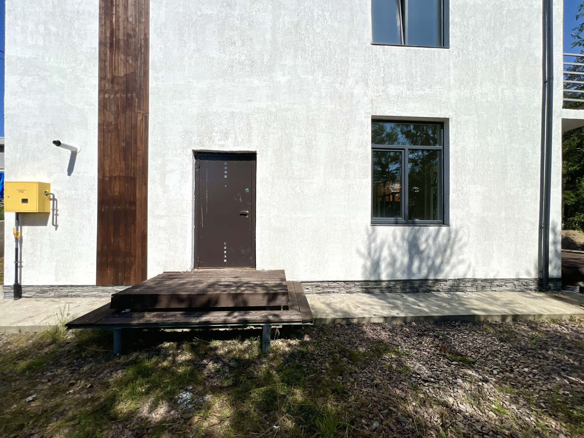 Фундамент дома выполнен из железобетонной плиты толщиной 250 мм. Стены дома построены из газобетона толщиной 300 мм с утеплением 150 мм. Фасад выполнен по технологии мокрый фасад с наружным оштукатуриванием и утеплением.