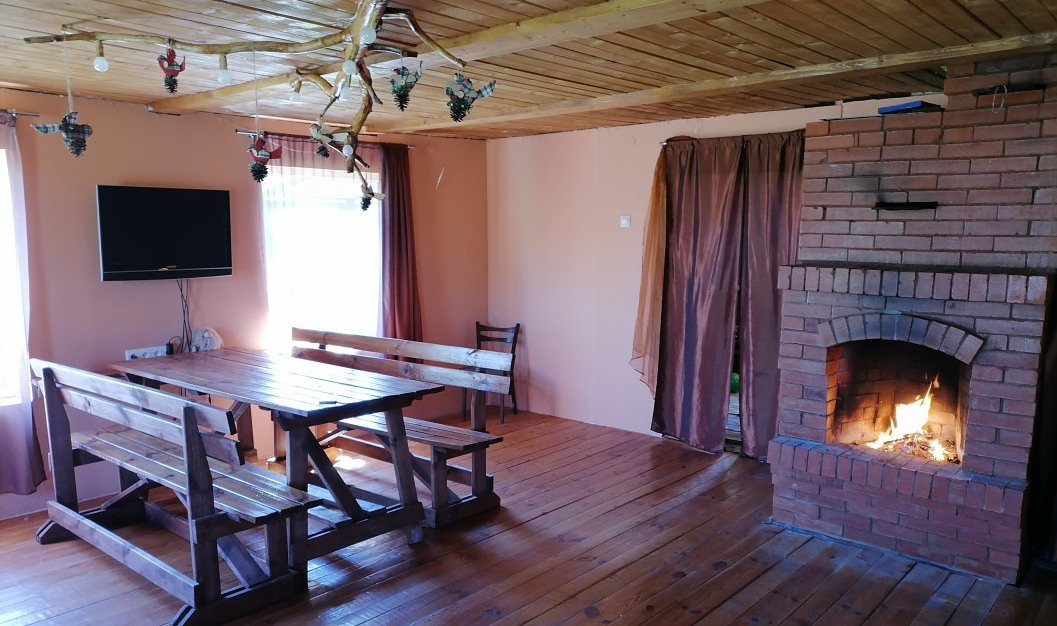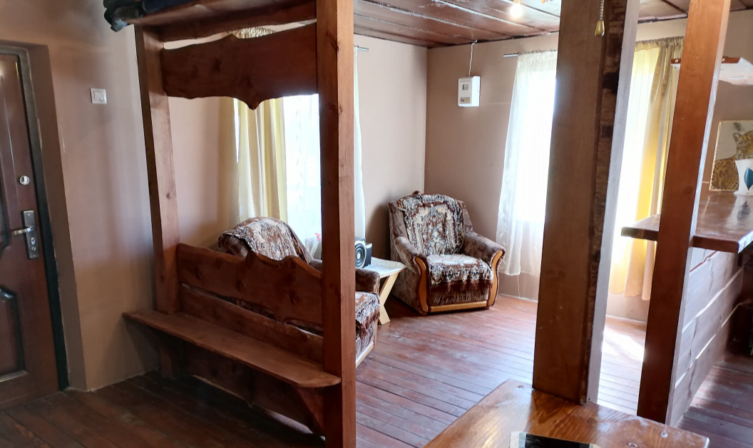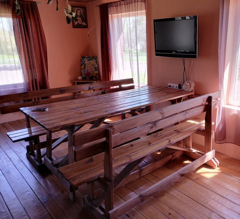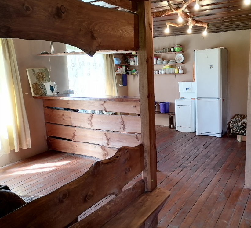 Конструктив Дома: деревянный, каркасный, снаружи зашит просмаленной, пропитанной сосновой доской. Предметы быта, мебель ручной работы, деревянные.